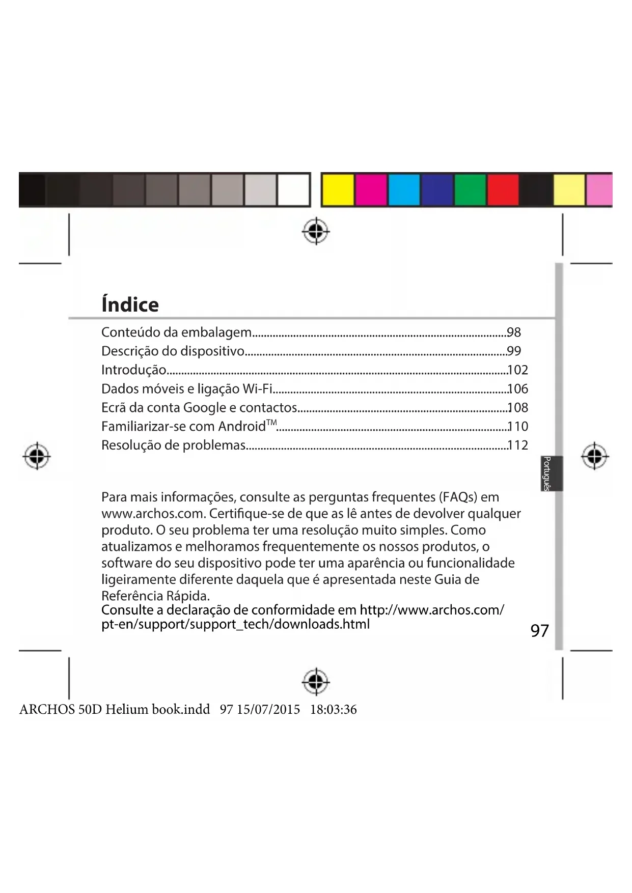 Para mais informações, consulte as perguntas frequentes (FAQs) em www.archos.com. Certique-se de que as lê antes de devolver qualquer produto. O seu problema ter uma resolução muito simples. Como atualizamos e melhoramos frequentemente os nossos produtos, o software do seu dispositivo pode ter uma aparência ou funcionalidade ligeiramente diferente daquela que é apresentada neste Guia de Referência Rápida. Consulte a declaração de conformidade em http://www.archos.com/ pt-en/support/support_tech/downloads.html ARCHOS 50D Helium book.indd 97 15/07/2015 18:03:3698 Conteúdo da embalagem Verique se tem os seguintes itens na embalagem do seu produto: - ARCHOS 50D Helium - Bateria - Headset - Cabo USB - Carregador - Guia do usuário - Garantia, avisos legais e de segurança Os itens fornecidos com o seu dispositivo e os acessórios disponíveis podem variar entre regiões e fornecedores de serviços. Os itens fornecidos foram concebidos exclusivamente para o seu dispositivo e podem ser incompatíveis com outros dispositivos. O uso de acessórios não aprovados pode resultar em mau funcionamento do seu dispositivo. ARCHOS 50D Helium book.indd 98 15/07/2015 18:03:3699