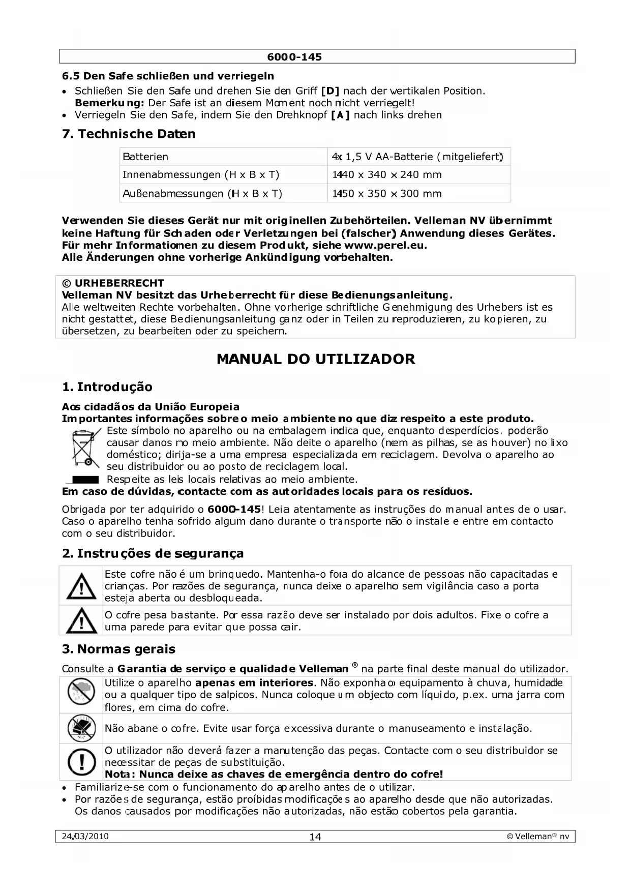 Este cofre não é um brinqueo. Mantenha-o fora do alcance de pessoas não capacitasadas e crianças. Por razões de segurar, nunca deixe o aparecido sem vigilência caso a porta esteja aberta ou desbloqueada.