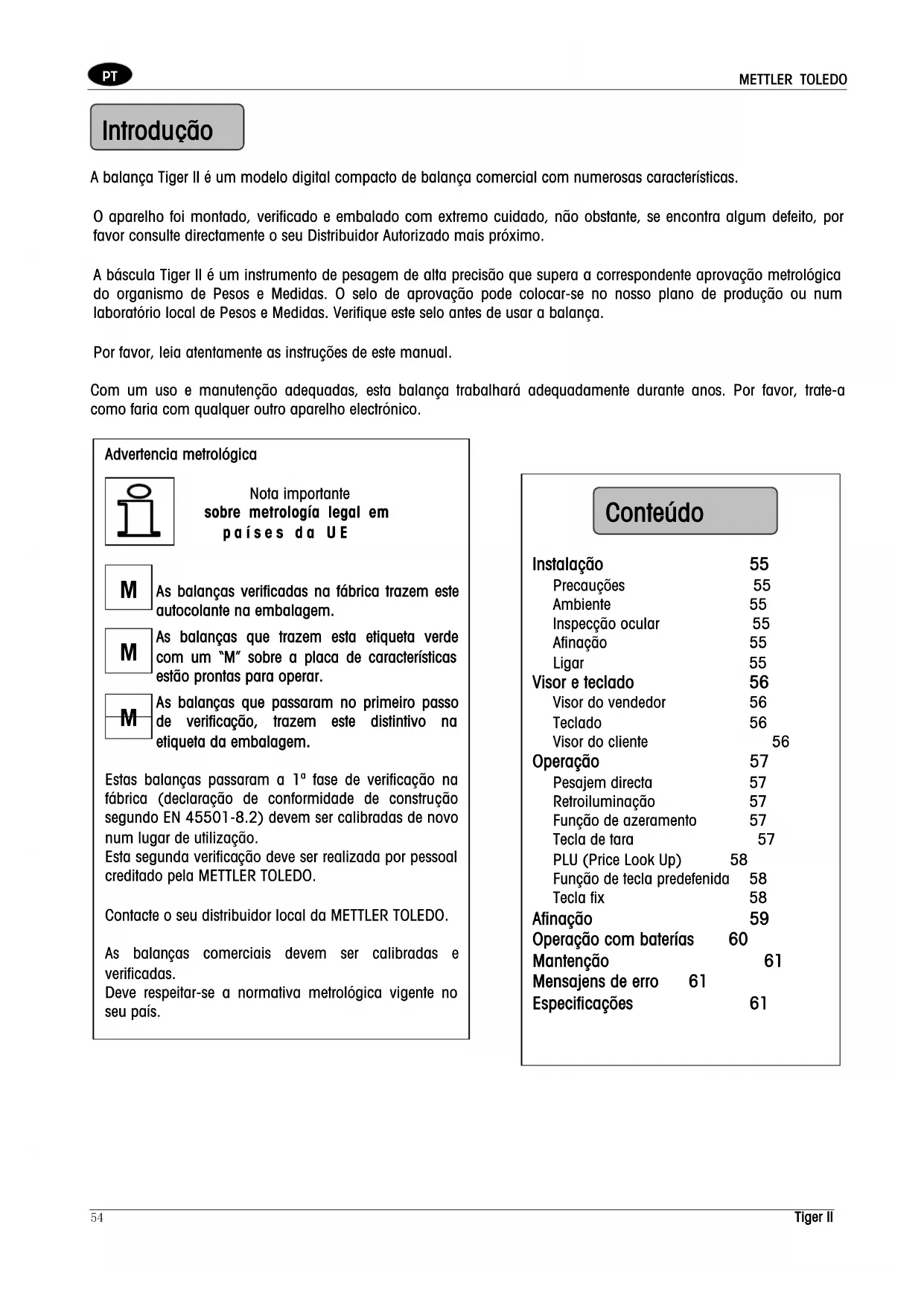 Instalação 55 Precauções 55 Ambiente 55 Inspecção ocular 55 Afinação 55 Ligar 55 Visor e teclado 56 Visor do vendedor 56 Teclado 56 Visor do cliente 56 Operação 57 Pesajem directa 57 Retroiluminação 57 Função de azeramento 57 Tecla de tara 57 PLU (Price Look Up) 58 Função de tecla predefenida 58 Tecla fix 58 Afinação 59 Operação com baterías 60 Mantenção 61 Mensajens de erro 61 Especificações 61 ConteúdoMETTLER TOLEDO Tiger II 55