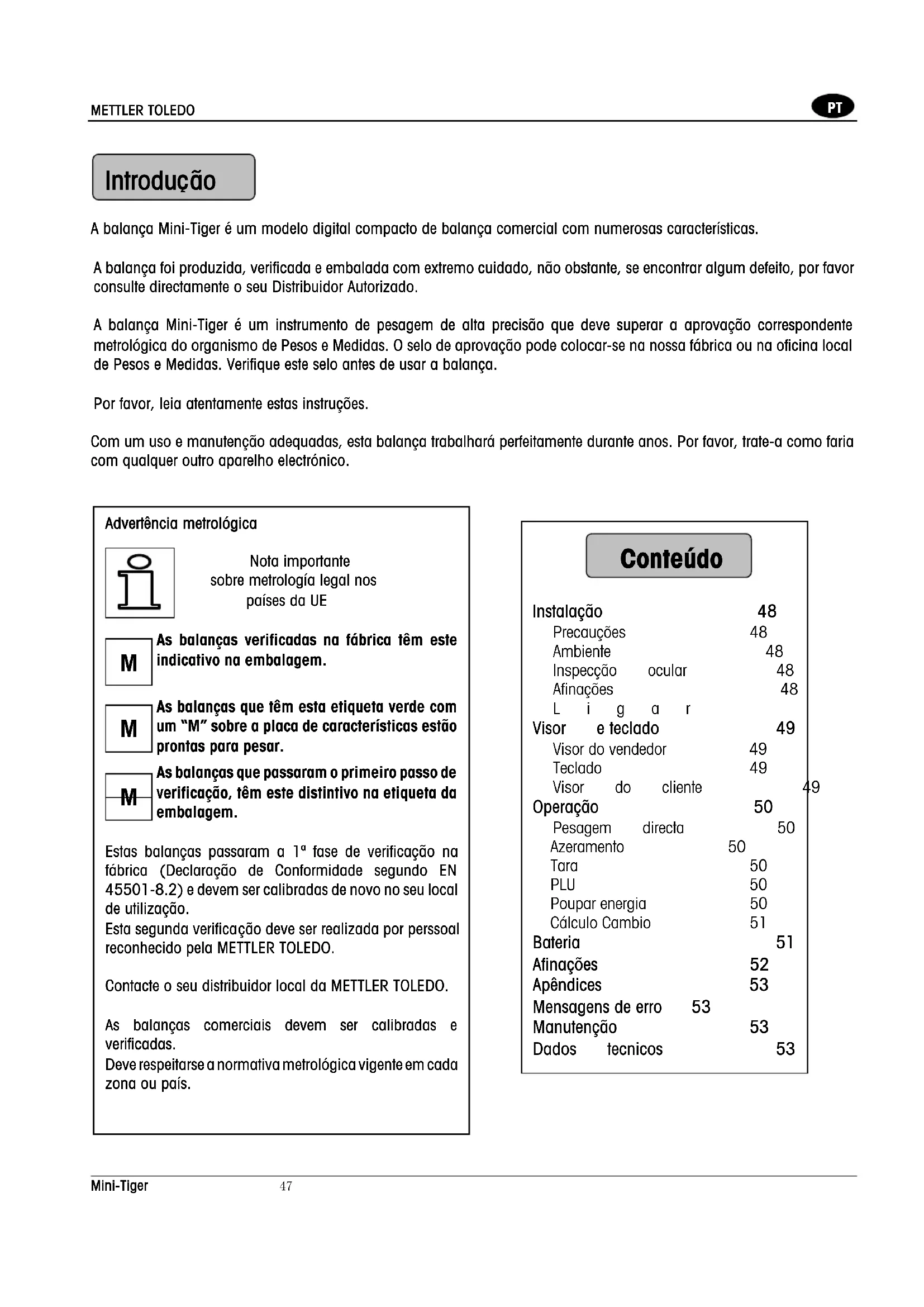 Instalação 48 Precauções 48 Ambiente 48 Inspecção ocular 48 Afinações 48 Ligar 48 Visor e teclado 49 Visor do vendedor 49 Teclado 49 Visor do cliente 49 Operação 50 Pesagem directa 50 Azeramento 50 Tara 50 PLU 50 Poupar energia 50 Cálculo Cambio 51 Bateria 51 Afinações 52 Apêndices 53 Mensagens de erro 53 Manutenção 53 Dados tecnicos 53 ConteúdoMETTLER TOLEDO 48 Mini-Tiger