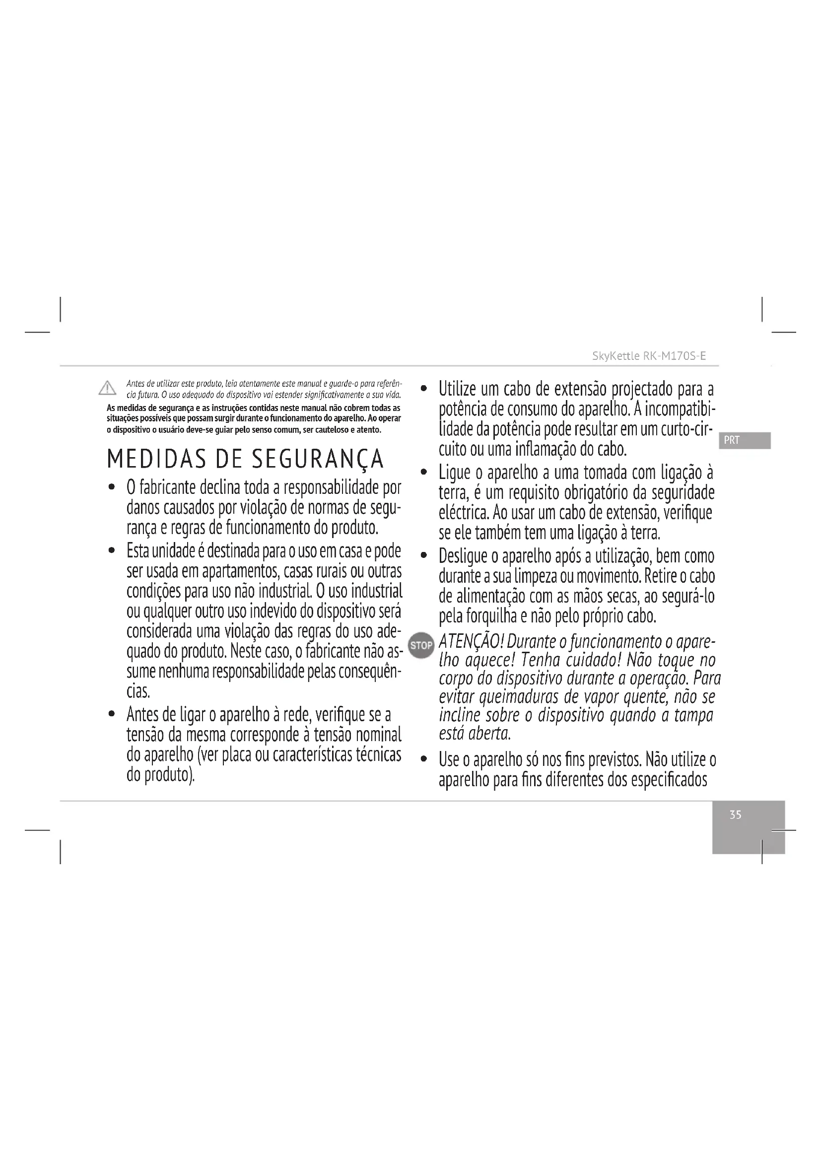 Este aparelho só pode ser utilizado por crianças a partir dos 8 anos e por pessoas com capacidades físicas, sensoriais ou mentais limitadas, ou pessoas com falta de experiência ou conhecimento, caso tenham recebido supervisão ou formação sobre como utilizar o aparelho de forma segura e perce- bam os perigos inerentes. As crianças não devem utilizar este aparelho como um brinquedo. A lim-SkyKettle RK-M170S-E
