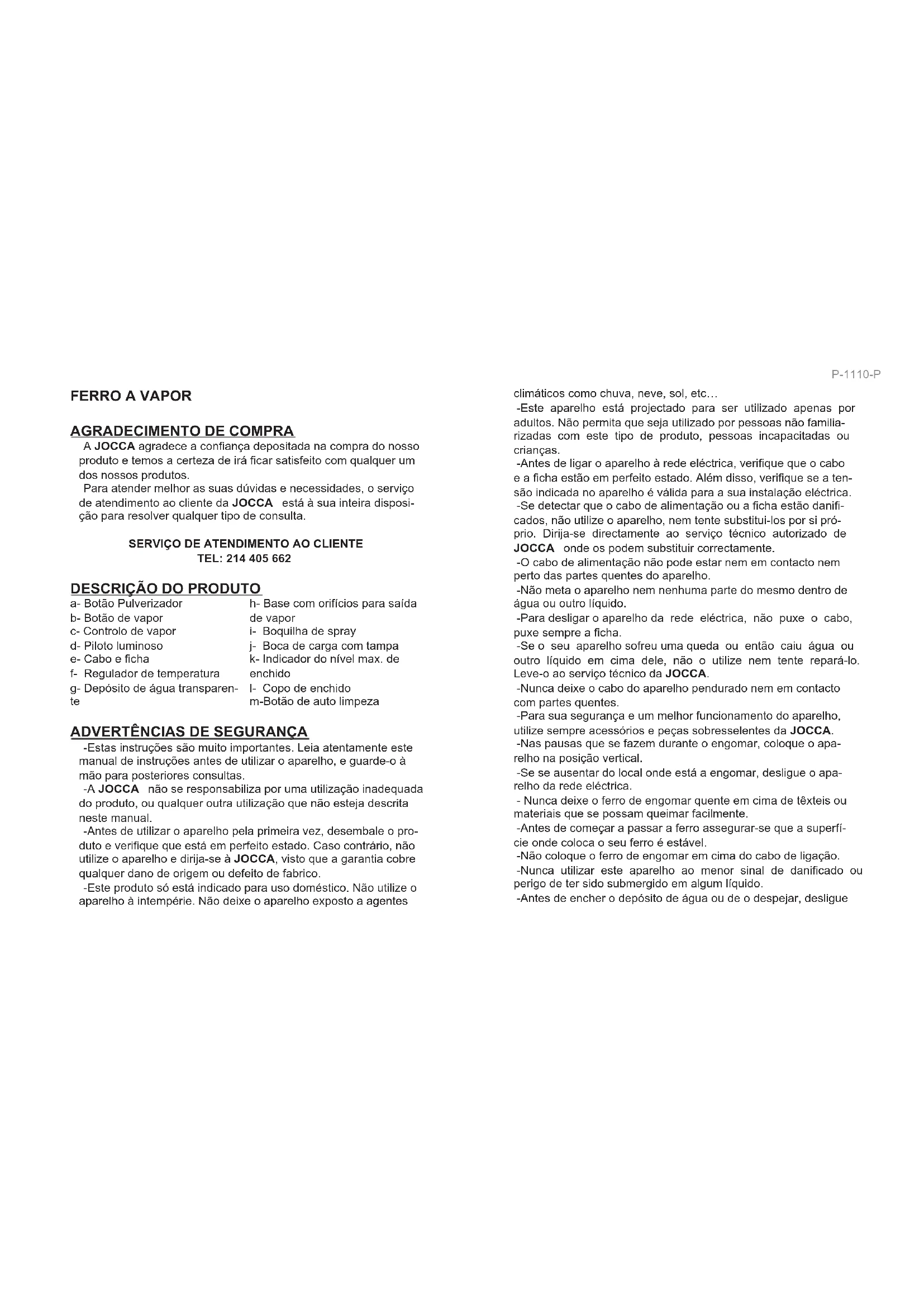 -Se detector que o cabo de alimentacao ou a fichte está danificados, não utilize o aparelho, nem tente substitui-los por si proprio. Dirija-se直达mente ao service专业技术 autorizzato de JOCCA onde os poder substituir correctamente.