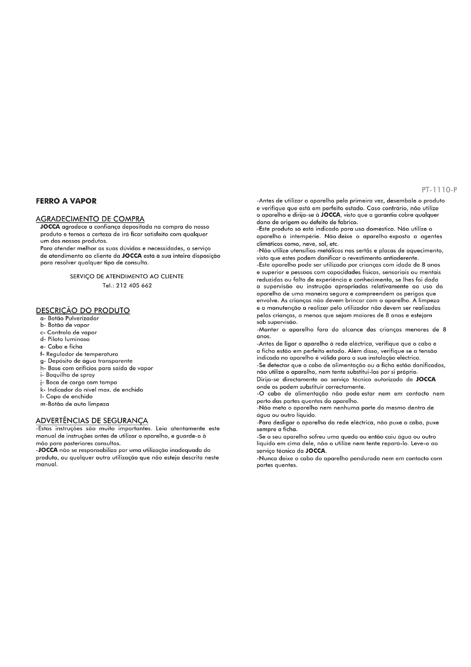 -Estas instruções são muito importantes. Leia atentamente este manual de instruções antes de utilizar o aparelho, e guarde-o à mão para posteriores consultas. -JOCCA não se responsabiliza por uma utilização inadequada do produto, ou qualquer outra utilização que não esteja descrita neste manual. -Antes de utilizar o aparelho pela primeira vez, desembale o produto e verifique que está em perfeito estado. Caso contrário, não utilize o aparelho e dirija-se à JOCCA, visto que a garantia cobre qualquer dano de origem ou defeito de fabrico. -Este produto só está indicado para uso doméstico. Não utilize o aparelho à intempérie. Não deixe o aparelho exposto a agentes climáticos como, neve, sol, etc. -Não utilize utensílios metálicos nas sertãs e placas de aquecimento, visto que estes podem danificar o revestimento antiaderente. -Este aparelho pode ser utilizado por crianças com idade de 8 anos e superior e pessoas com capacidades físicas, sensoriais ou mentais reduzidas ou falta de experiência e conhecimento, se lhes foi dada a supervisão ou instrução apropriadas relativamente ao uso do aparelho de uma maneira segura e compreendem os perigos que envolve. As crianças não devem brincar com o aparelho. A limpeza e a manutenção a realizar pelo utilizador não devem ser realizadas pelas crianças, a menos que sejam maiores de 8 anos e estejam sob supervisão. -Manter o aparelho fora do alcance das crianças menores de 8 anos. -Antes de ligar o aparelho à rede eléctrica, verifique que o cabo e a ficha estão em perfeito estado. Além disso, verifique se a tensão indicada no aparelho é válida para a sua instalação eléctrica. -Se detectar que o cabo de alimentação ou a ficha estão danificados, não utilize o aparelho, nem tente substitui-los por si próprio. Dirija-se directamente ao serviço técnico autorizado de JOCCA onde os podem substituir correctamente. -O cabo de alimentação não pode estar nem em contacto nem perto das partes quentes do aparelho. -Não meta o aparelho nem nenhuma parte do mesmo dentro de água ou outro líquido. -Para desligar o aparelho da rede eléctrica, não puxe o cabo, puxe sempre a ficha. -Se o seu aparelho sofreu uma queda ou então caiu água ou outro líquido em cima dele, não o utilize nem tente repará-lo. Leve-o ao serviço técnico da JOCCA. -Nunca deixe o cabo do aparelho pendurado nem em contacto com partes quentes. PT-1110-PT-Para sua segurança e um melhor funcionamento do aparelho, utilize sempre acessórios e peças sobresselentes da JOCCA. -Nas pausas que se fazem durante o engomar, coloque o aparelho na posição vertical. -Se se ausentar do local onde está a engomar, desligue o aparelho da rede eléctrica. - Nunca deixe o ferro de engomar quente em cima de têxteis ou materiais que se possam queimar facilmente. -Antes de começar a passar a ferro assegurar-se que a superfície onde coloca o seu ferro é estável. -Não coloque o ferro de engomar em cima do cabo de ligação. -Nunca utilizar este aparelho ao menor sinal de danificado ou perigo de ter sido submergido em algum líquido. -Antes de encher o depósito de água ou de o despejar, desligue sempre o aparelho à rede eléctrica. -Verifique que o depósito de água está fechado antes de ligar o aparelho à rede eléctrica. -Ao terminar de engomar, desligue o aparelho da rede eléctrica e despeje o depósito de água. -Este aparelho emite vapor que pode provocar queimaduras. Não dirigir o jacto de vapor contra animais ou pessoas e nunca engomar em cima de roupas que estejam vestidas.