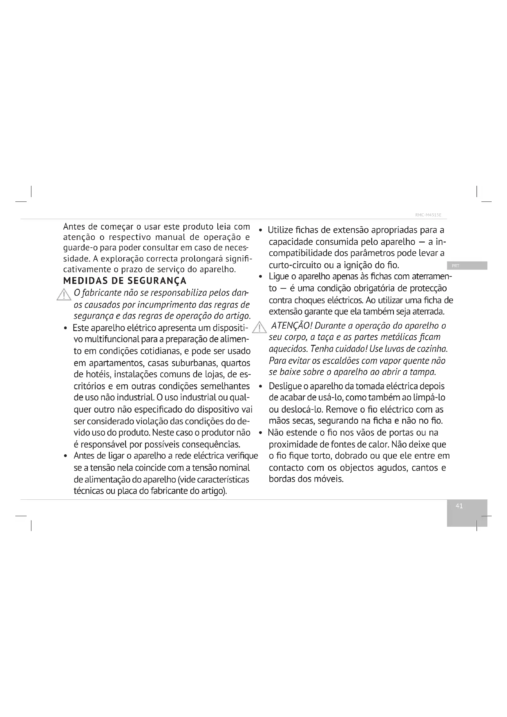 O aparelho é abrangido pela garantia para o prazo de 2 anos a partir do momento da sua aquisição. Ao longo do prazo de garantia o fabricante obriga-se a eliminar todos os defeitos de fabrico provocados pela falta de qualidade de materiais ou de montagem, por meio de reparação, substituição das partes ou substituição do aparelho inteiro. A garantia entra em vigor apenas no caso de uma data de aquisição comprovada pelo carimbo da loja e pela assina- tura do vendedor no original do talão de garantia. A presente garantia é apenas reconhecida no caso de o aparelho ter sido usado de acordo com o manual de operação, não foi reparado ou desmontado e não foi danicado devido a um indevido tratamento, e o conjunto inicial do aparelho é preservado. A presente garantia não abrange os gastos naturais do aparelho e os materiais consumíveis (ltros, lâmpadas, revestimentos cerâmicos e de Teon, impermea- bilização, etc.). A vida do produto e o prazo de garantia devem ser calculados a partir da data da venda ou da data de fabricação do produto (no caso se não for possível determinar a data da venda). A data de fabricação do dispositivo pode ser encontrada no número de série localizado na etiqueta de identicação ligada ao corpo do produto. O número de série é composto de 13 dígitos. Caracteres 6 e 7 indicam o mês, 8 indica o ano de produção. O prazo de serviço do aparelho indicado pelo fabricante é de 5 anos a contar da data da sua aquisição no caso de o aparelho ser operado de acordo com o presente manual e com as normas técnicas aplicáveis. A embalagem, o manual de operação e o próprio aparelho devem ser reciclados de acordo com o programa local de reciclagem de resíduos. Não despeje o aparelho junto com o lixo doméstico normal.47 RMC-M4515E DNK Før du bruger dette produkt, læs brugsanvisning om- hyggeligt og hold som en reference. Den korrekte brug af enheden forlænger betydeligt dets levetid. SIKKERHEDSANVISNINGER Producenten tager ikke ansvar på skader der er resultater af manglende overholdelse af sikker- hedskrav og reglerne for anvendelse af produktet.