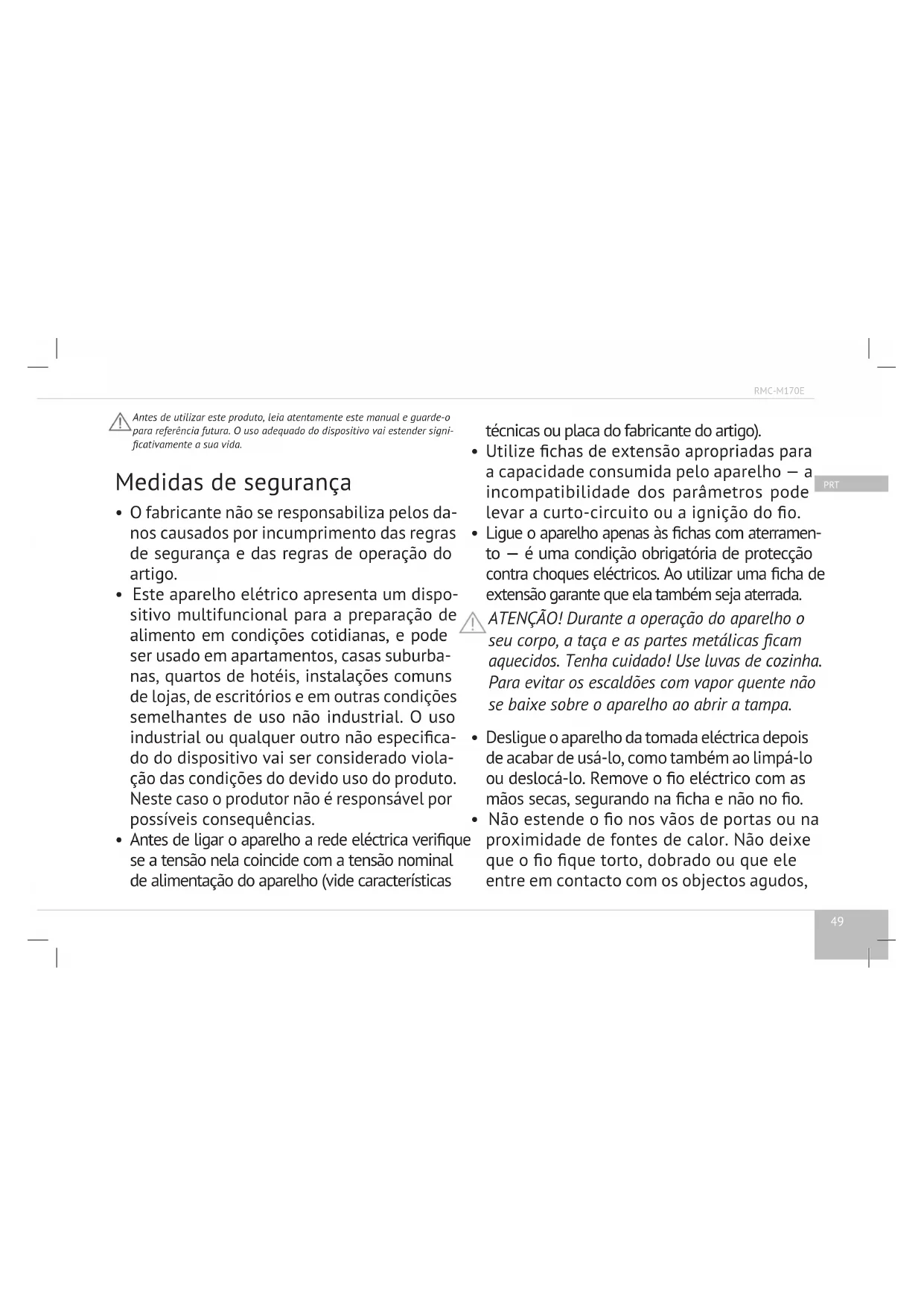 Mais adiante siga os passos 6-8 da secção”Procedimento comum de acção para o uso dos programas automáticos”. Programa “RICE/GRAIN” Recomenda-se para cozinhar arroz e papas de diferentes tipos de cereais, assim como para a preparação de guarnições. O tempo de preparação por omissão – 35 minutos. É possível o controlo manual de tempo de preparação no botão regu- lador de tempo de 5 minutos a 4 horas com intervalos ajustados de 1 minuto. Programa “SLOW COOK” Recomendado para a preparação de leite morno, guisado, joelho de porco, carne com gelatina e gelatinas . O tempo de preparação por omissão é de – 2 horas e 30 minutos. É possível regular manualmente o tempo de preparação53 PRT RMC-M170E no botão regulador de tempo de 10 minutos a 12 horas com intervalos de ajuste de 10 minutos. Programa “PILAF” Recomendado para a preparação de paelha com carne, peixe ou legumes. O tempo de preparação por omissão é – 1 hora. É possível regular manualmente o tempo de preparação no botão regulador de tempo de 10 minutos a 2 horas com intervalos de ajuste de 5 minutos. Programa “FRY” Recomendado para assar produtos tais como: carne, peixe, mariscos, e vegetais. O tempo de preparação por defeito depende do programa selecionado ( pres- siona o botão “Product” ): “MEAT” – 15 minutos, “ FISH ” – 12 minutos, “ VEGETA- BLES ” – 18 minutos. É possível regular manualmente o tempo de preparação no botão regulador de tempo de 5 minutos a 2 horas com intervalos de ajuste de 1 minuto. A função de programador de início não está disponível. Programa “STEW” Recomendado para guisados de carne e produtos à base de carne, peixe, ma- riscos e vegetais, bem como para a preparação de carne com gelatina e outros pratos, que exigem longo tempo de cozimento. O tempo de cozedura por omis- são depende do programa escolhido (seleciona-se pressionando o botão “Pro- duct” ): “MEAT” – 1 hora, “FISH” – 35 minutos, “VEGETABLES” – 40 minutos. É possível regular manualmente o tempo de preparação no botão regulador de tempo de 10 minutos a 12 horas com intervalos de 5 minutos. Programa “PASTA” Recomendado para a preparação de massas, cozer ovos, salsichas. O tempo de preparação por omissão é de – 8 minutos. É possível regular manualmente o tempo de preparação no botão regulador de tempo de 2 minutos a 1 hora com intervalos de 1 minuto. A função do programador de início não está disponível. Coloque água no recipiente. Cuide para que o nível da água esteja abaixo da marca máxima da superfície interna do recipiente. Siga os passos 2-7 da secção ”Procedimento comum de acção para o uso dos programas automáticos”. Quan- do a água ferver o robô emite um sinal. Abra a tampa com cuidado e coloque os produtos dentro, feche a tampa até ouvir um click. Pressione o botão “Start/ Reheat”. Começa a iniciar-se o programa escolhido e a contagem regressiva de tempo de cozimento. Mais á frente siga os passos 8-9 da secção”Procedimento comum de acção para o uso dos los programas automáticos”. Na preparação de alguns produtos forma-se espuma. Para evitar que aumen- te e saia do recipiente pode-se abrir a tampa ao m de alguns minutos depois de ter colocado os produtos na água fervente. Programa “VACUUM” Especialmente destinado para cozer os produtos embalados a vácuo. O tempo de preparação por omissão – 2 horas 30 minutos. É possível regular manual- mente o tempo de preparação no botão regulador de tempo de 5 minutos a 12 horas com intervalos de 10 minutos. Programa “SOUP” Recomendado para a preparação de diferentes entradas, assim como compotas e bebidas. O tempo de preparação por omissão é de – 1 hora. É possível regular manualmente o tempo de preparação no botão regulador de tempo de 10 minutos a 8 horas com intervalos de 5 minutos. Programa “YOGURT” Recomendado para a preparação de Iogurtes e levedação de massas. O tempo de preparação por omissão é de – 8 horas. É possível regular manualmente o tempo de preparação no botão regulador de tempo de 10 minutos a 12 horas com intervalos de 5 minutos. A função conservador de calor não está disponível. Programa “BAKE” É recomendado para a preparação de produtos de panicação (bolos, biscoitos, tortas). O tempo de preparação por omissão é de – 45 minutos. É possível re- gular manualmente o tempo de preparação no botão regulador de tempo de 10 minutos a 8 horas com intervalos de 5 minutos. Em panicação recomenda-se desligar a função de retenção de calor em todas as fases de preparação. Programa “STEAM” Recomendado para cozinhar a vapor: carne, produtos à base de carne, pratos dietéticos, e pratos de alimentação infantil. O tempo de omissão depende do programa escolhido (escolhe-se pressionando o botão “PRODUCT”): “MEAT” - 40 minutos, “FISH” – 25 minutos, “VEGETABLES” – 30 minutos. É possível regular manualmente o tempo de preparação no botão regulador de tempo de 5 mi- nutos a 2 horas com intervalos de 5 minutos. Para se preparar para este programa use o recipiente especial com controlo de volume (incluído no kit):