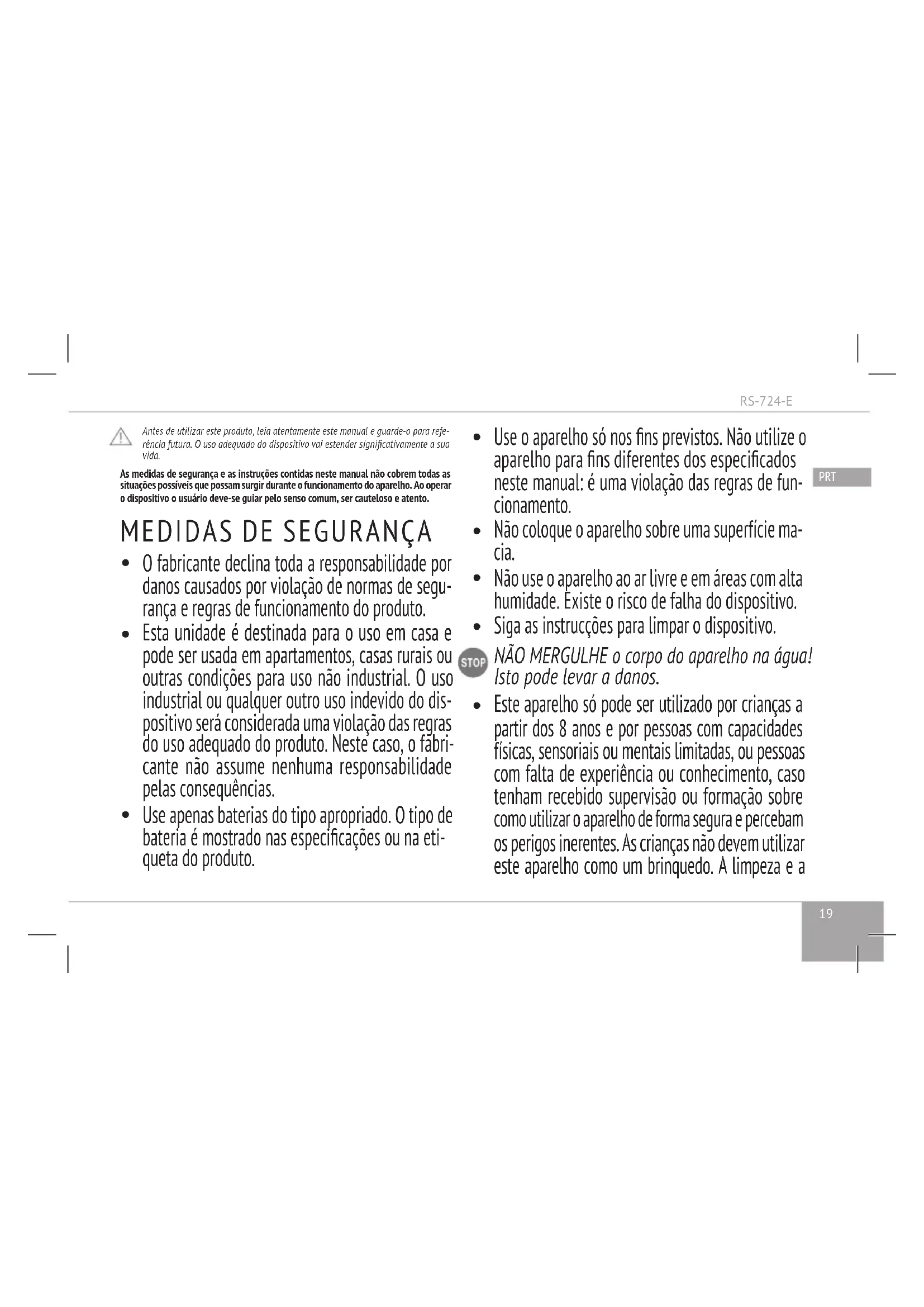 Substitua a bateria de acordo com a secção “Antes da primeira inserção” Os valores no display não correspondem ao valor ecaz Foi seleccionada a unidade errada de peso Pressione o botão para seleccio- nar a unidade de pesagem dese- jada22 Avaria Causa eventual Modo de resolver Os valores no display não correspondem ao valor ecaz Não foram cumpridos os requi- sitos obrigatórios para pesagem Coloque a balança só em uma superfície horizontal plana O visor mostra uma mensagem de erro: Lo Não foram cumpridos os requi- sitos obrigatórios para pesagem Coloque a balança só em uma superfície horizontal plana O visor mostra uma mensagem de erro: EEEE Na plataforma de pesagem é instalada uma carga de peso superior a 5 kg. A gama de medição de peso disponível é de 5-5000 g. Não sobrecarregue a plataforma de instrumentos O visor mostra uma mensagem de erro: UnST A posição das escalas é instável Coloque a balança de cozinha em lugar rme, estável e numa su- perfície horizontal O aparelho desliga se automaticamente O sistema de desligamento au- tomático foi activado A balança desliga-se automati- camente após o uso dentro de 5 minutos Caso não consiga eliminar os defeitos, contacte por favor o Centro de Serviço autori- zado. Utilização ecologicamente inofensiva (utilização eléctrica e maquinaria eletrónica) O descarte de embalagens, manual de utilização, assim como o robô, deve ser feito em conformidade com os programas de reciclagem local. Preocu- pese com o meio ambiente: não coloque estes produtos no lixo doméstico. Os aparelhos utilizados (antigos) não devem ser colocados no lixo doméstico, devem ser recolhidos separadamente. Os proprietários de aparelhos elétricos antigos são obrigados a leva-los aos pontos especiais de recolha o dá-los às organizações respec- tivas. Assim está a ajudar o programa de reciclagem de matérias-primas, e também à limpeza de substâncias contaminantes. Este aparelho está etiquetado de acordo com a Directiva 2012/19/UE do Parlamento Europeu e do Conselho, relativa aos resíduos de equipamentos eléctricos e electrónicos (REEE). A directriz determina o quadro para a devolução e a reciclagem de aparelhos usados, como aplicável em toda a UE.RS-724-E