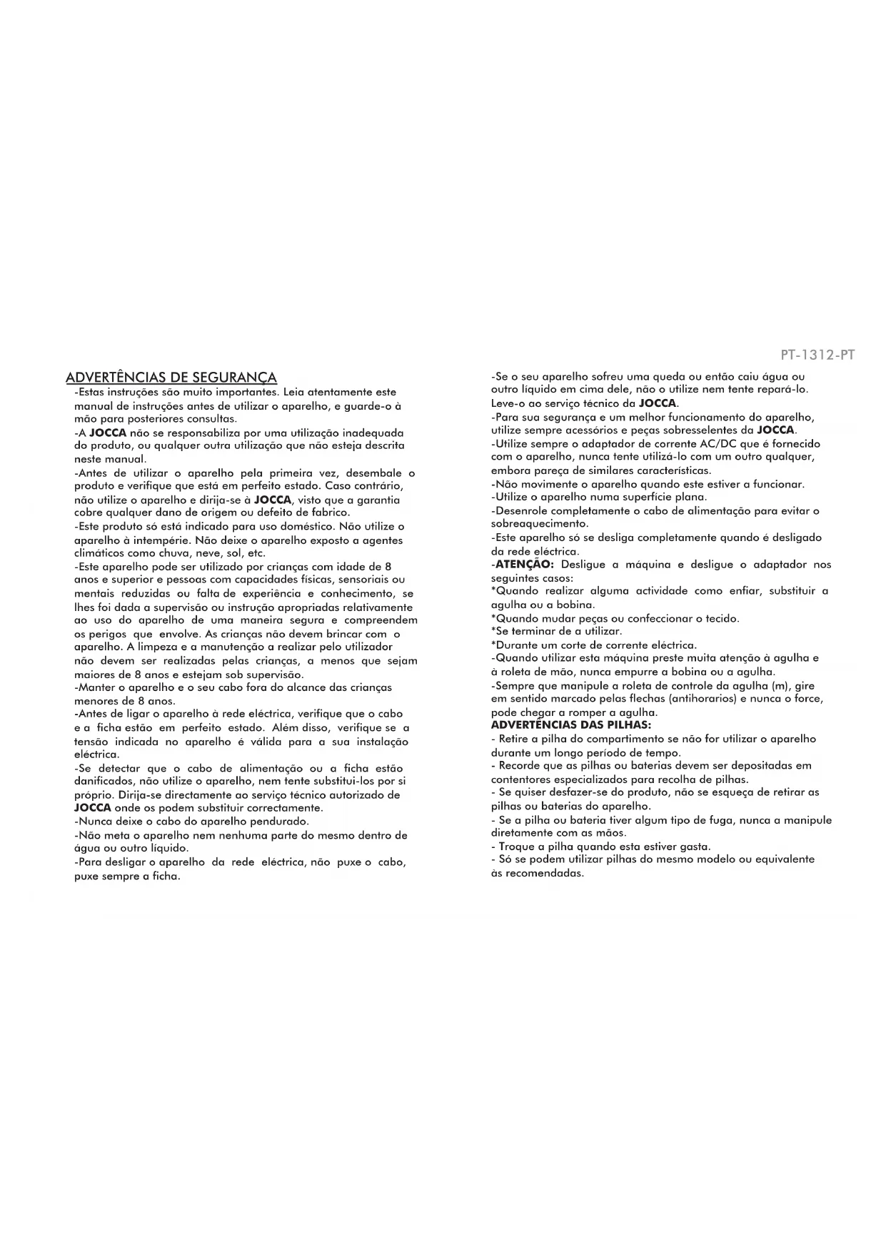 -Estas instruções são muito importantes. Leia atentamente este manual de instruções antes de utilizar o aparelho, e guarde-o à mão para posteriores consultas. -A JOCCA não se responsabiliza por uma utilização inadequada do produto, ou qualquer outra utilização que não esteja descrita neste manual. -Antes de utilizar o aparelho pela primeira vez, desembale o produto e verifique que está em perfeito estado. Caso contrário, não utilize o aparelho e dirija-se à JOCCA, visto que a garantia cobre qualquer dano de origem ou defeito de fabrico. -Este produto só está indicado para uso doméstico. Não utilize o aparelho à intempérie. Não deixe o aparelho exposto a agentes climáticos como chuva, neve, sol, etc. -Este aparelho pode ser utilizado por crianças com idade de 8 anos e superior e pessoas com capacidades físicas, sensoriais ou mentais reduzidas ou falta de experiência e conhecimento, se lhes foi dada a supervisão ou instrução apropriadas relativamente ao uso do aparelho de uma maneira segura e compreendem os perigos que envolve. As crianças não devem brincar com o aparelho. A limpeza e a manutenção a realizar pelo utilizador não devem ser realizadas pelas crianças, a menos que sejam maiores de 8 anos e estejam sob supervisão. -Manter o aparelho e o seu cabo fora do alcance das crianças menores de 8 anos. -Antes de ligar o aparelho à rede eléctrica, verifique que o cabo e a ficha estão em perfeito estado. Além disso, verifique se a tensão indicada no aparelho é válida para a sua instalação eléctrica. -Se detectar que o cabo de alimentação ou a ficha estão danificados, não utilize o aparelho, nem tente substitui-los por si próprio. Dirija-se directamente ao serviço técnico autorizado de JOCCA onde os podem substituir correctamente. -Nunca deixe o cabo do aparelho pendurado. -Não meta o aparelho nem nenhuma parte do mesmo dentro de água ou outro líquido. -Para desligar o aparelho da rede eléctrica, não puxe o cabo, puxe sempre a ficha. -Se o seu aparelho sofreu uma queda ou então caiu água ou outro líquido em cima dele, não o utilize nem tente repará-lo. Leve-o ao serviço técnico da JOCCA. -Para sua segurança e um melhor funcionamento do aparelho, utilize sempre acessórios e peças sobresselentes da JOCCA. -Utilize sempre o adaptador de corrente AC/DC que é fornecido com o aparelho, nunca tente utilizá-lo com um outro qualquer, embora pareça de similares características. -Não movimente o aparelho quando este estiver a funcionar. -Utilize o aparelho numa superfície plana. -Desenrole completamente o cabo de alimentação para evitar o sobreaquecimento. -Este aparelho só se desliga completamente quando é desligado da rede eléctrica. -ATENÇÃO: Desligue a máquina e desligue o adaptador nos seguintes casos: *Quando realizar alguma actividade como enfiar, substituir a agulha ou a bobina. *Quando mudar peças ou confeccionar o tecido. *Se terminar de a utilizar. *Durante um corte de corrente eléctrica. -Quando utilizar esta máquina preste muita atenção à agulha e à roleta de mão, nunca empurre a bobina ou a agulha. -Sempre que manipule a roleta de controle da agulha (m), gire em sentido marcado pelas flechas (antihorarios) e nunca o force, pode chegar a romper a agulha. ADVERTÊNCIAS DAS PILHAS: - Retire a pilha do compartimento se não for utilizar o aparelho durante um longo período de tempo. - Recorde que as pilhas ou baterias devem ser depositadas em contentores especializados para recolha de pilhas. - Se quiser desfazer-se do produto, não se esqueça de retirar as pilhas ou baterias do aparelho. - Se a pilha ou bateria tiver algum tipo de fuga, nunca a manipule diretamente com as mãos. - Troque a pilha quando esta estiver gasta. - Só se podem utilizar pilhas do mesmo modelo ou equivalente às recomendadas. PT-1312-PT- A pilha deve ser colocada de acordo com a polaridade indicada. - Nunca coloque o compartimento das pilhas perto do fogo ou de uma fonte de calor. - Não deite as pilhas ao fogo nem coloque a unidade de controlo ao sol. - Não misturar pilhas novas com pilhas já usadas ou velhas.