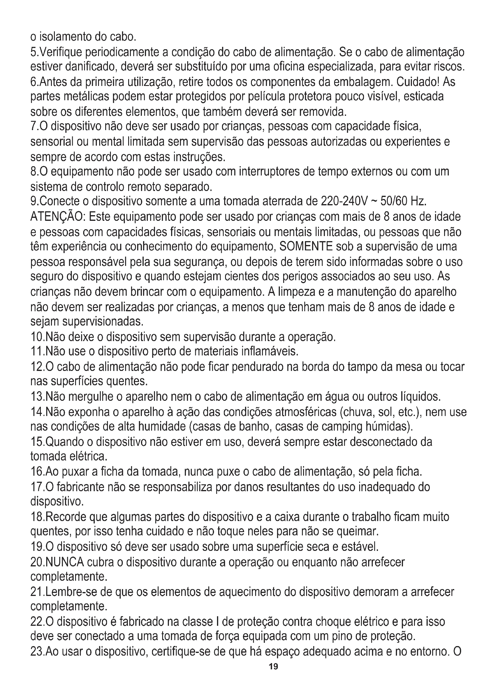 3.Certifique-se de que o cabo de alimentação e a ficha não apresentem danos visíveis. Obrigado por adquirir produtos da marca ADLER O dispositivo destina-se apenas ao uso doméstico. Cuidado! Antes de usar, é preciso ler estas instruções de operação para evitar acidentes e para fazer o uso correto do dispositivo. Guarde este manual para poder utilizá-lo facilmente quando for preciso. O fabricante não se responsabiliza por danos causados pelo uso do dispositivo contrário ao uso pretendido ou pelo manuseio inadequado. 2.Desenrole e endireite o cabo de alimentação antes de usar. Atención Superficie Caliente - La temperatura de las superficies accesibles puede ser más alta cuando el equipo está funcionando, lo que quiere decir que los elementos de la carcasa se calientan considerablemente durante el funcionamiento aparato. ¡PROCEDE CON PRECAUCIÓN! CONDIÇÕES GERAIS DE SEGURANÇA AS INSTRUÇÕES IMPORTANTES RELATIVAS À SEGURANÇA DE UTILIZAÇÃO DEVEM SER LIDAS COM ATENÇÃO E GUARDADAS