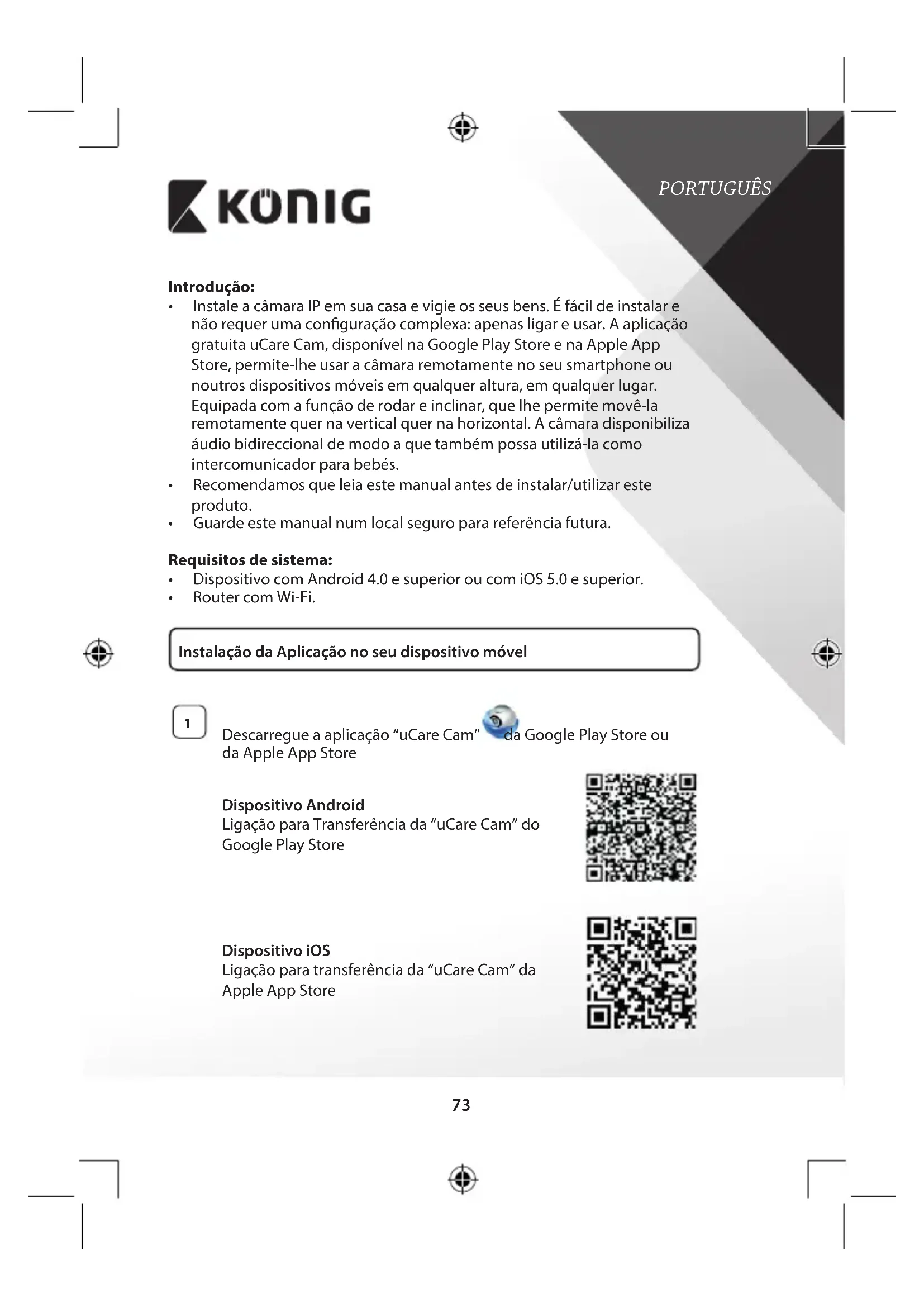 Descarregueaaplicação“uCareCam” daGooglePlayStoreou daAppleAppStore Dispositivo Android LigaçãoparaTransferênciada“uCareCam”do GooglePlayStore Dispositivo iOS Ligaçãoparatransferênciada“uCareCam”da AppleAppStorePORTUGUÊS