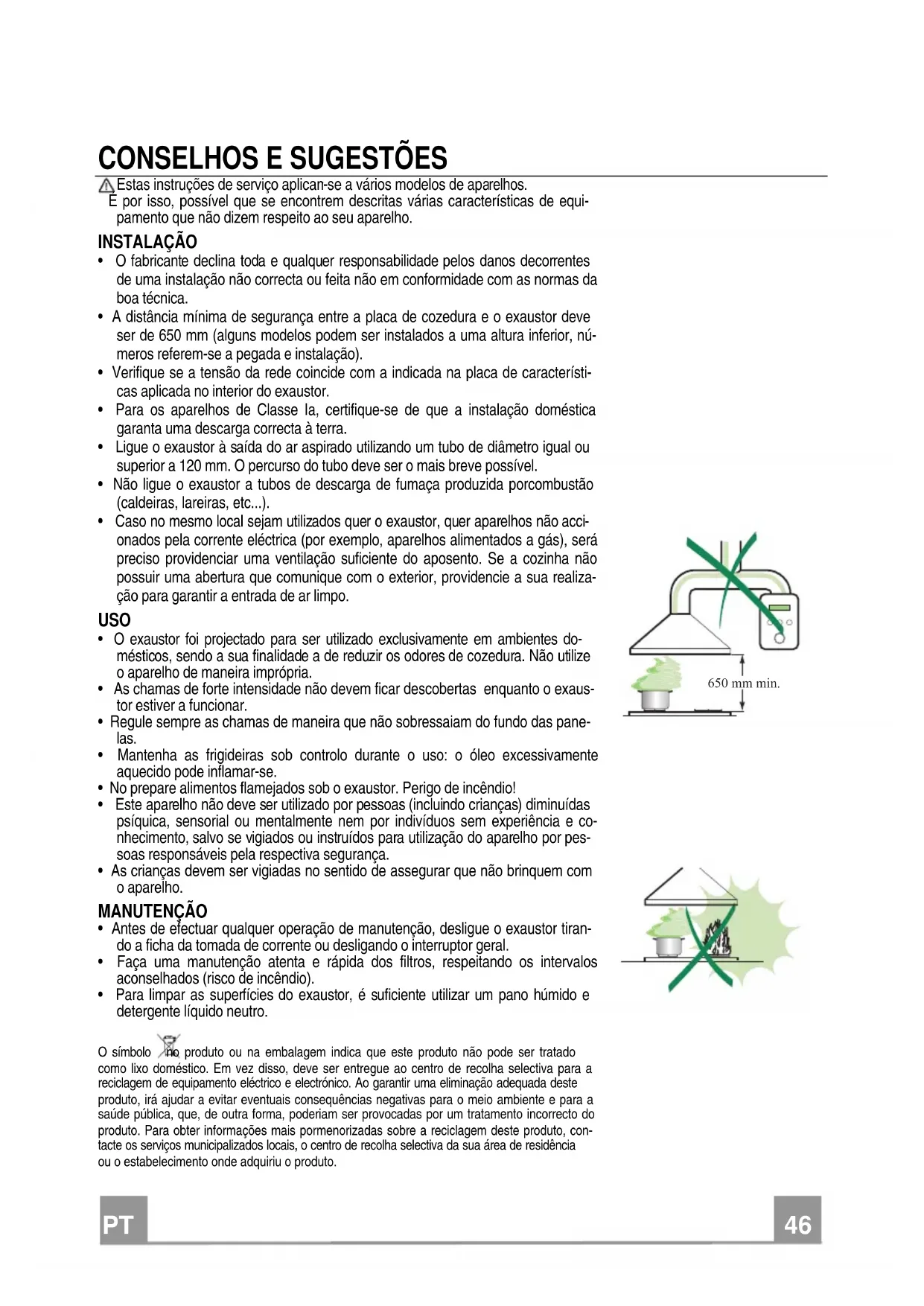 - Para limpar as superfícies do exaustor, é suficiente utilizar um pano húmido e detergente líquido neutro. O símbolo no produto ou na embalagem indica que este produto não pode ser tratado como lixo doméstico. Em vez disso, deve ser entregue ao centro de recolha selectiva para a reciclagem de equipamento eléctrico e electrónico. Ao garantir uma eliminação adequada deste produto, irá ajudar a evitar eventuais consequências negativas para o meio ambiente e para a saúde pública, que, de outra forma, poderiam ser provocadas por um tratamento incorrecto do produto. Para obter informações mais pormenorizadas sobre a reciclagem deste produto, con- tacte os serviços municipalizados locais, o centro de recolha selectiva da sua área de residência ou o estabelecimento onde adquiriu o produto.