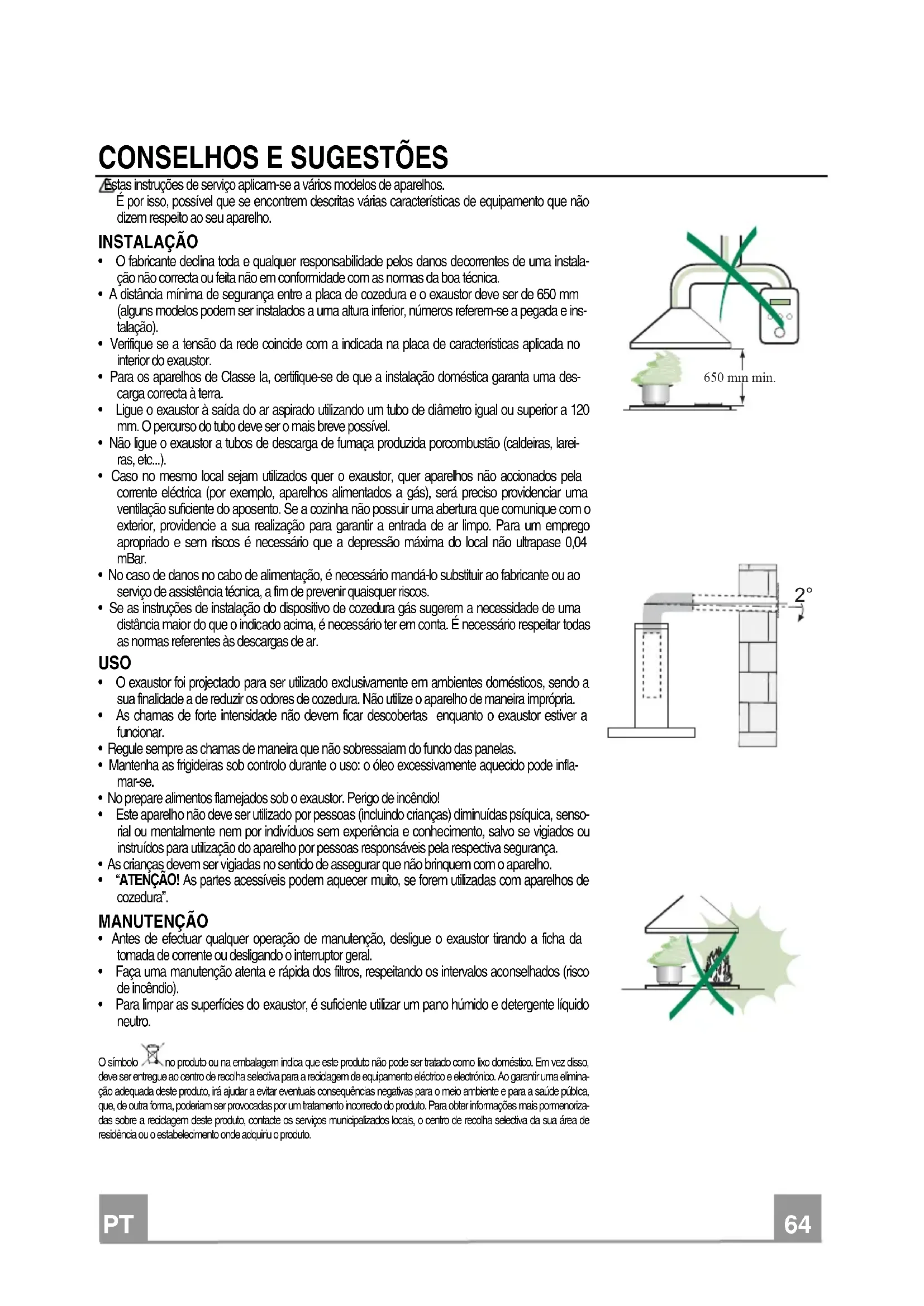 - Para limpar as superfícies do exaustor, é suficiente utilizar um pano húmido e detergente líquido neutro. O símbolo no produto ou na embalagem indica que este produto não pode ser tratado como lixo doméstico. Em vez disso, deve ser entregue ao centro de recolha selectiva para a reciclagem de equipamento eléctrico e electrónico. Ao garantir uma elimina- ção adequada deste produto, irá ajudar a evitar eventuais consequências negativas para o meio ambiente e para a saúde pública, que, de outra forma, poderiam ser provocadas por um tratamento incorrecto do produto. Para obter informações mais pormenoriza- das sobre a reciclagem deste produto, contacte os serviços municipalizados locais, o centro de recolha selectiva da sua área de residência ou o estabelecimento onde adquiriu o produto.