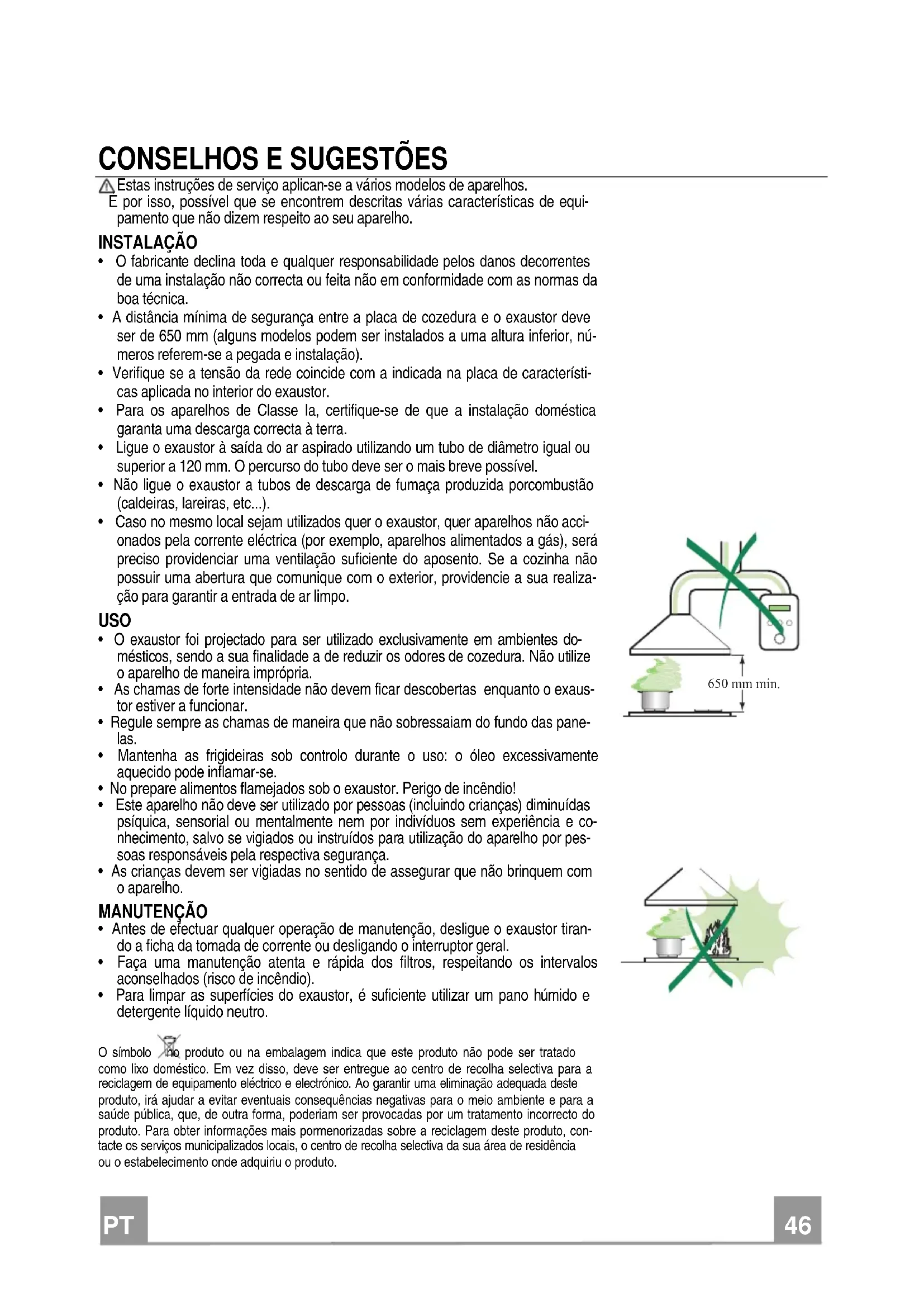 - Para limpar as superfícies do exaustor, é suficiente utilizar um pano húmido e detergente líquido neutro. O símbolo no produto ou na embalagem indica que este produto não pode ser tratado como lixo doméstico. Em vez disso, deve ser entregue ao centro de recolha selectiva para a reciclagem de equipamento eléctrico e electrónico. Ao garantir uma eliminação adequada deste produto, irá ajudar a evitar eventuais consequências negativas para o meio ambiente e para a saúde pública, que, de outra forma, poderiam ser provocadas por um tratamento incorrecto do produto. Para obter informações mais pormenorizadas sobre a reciclagem deste produto, con- tacte os serviços municipalizados locais, o centro de recolha selectiva da sua área de residência ou o estabelecimento onde adquiriu o produto.