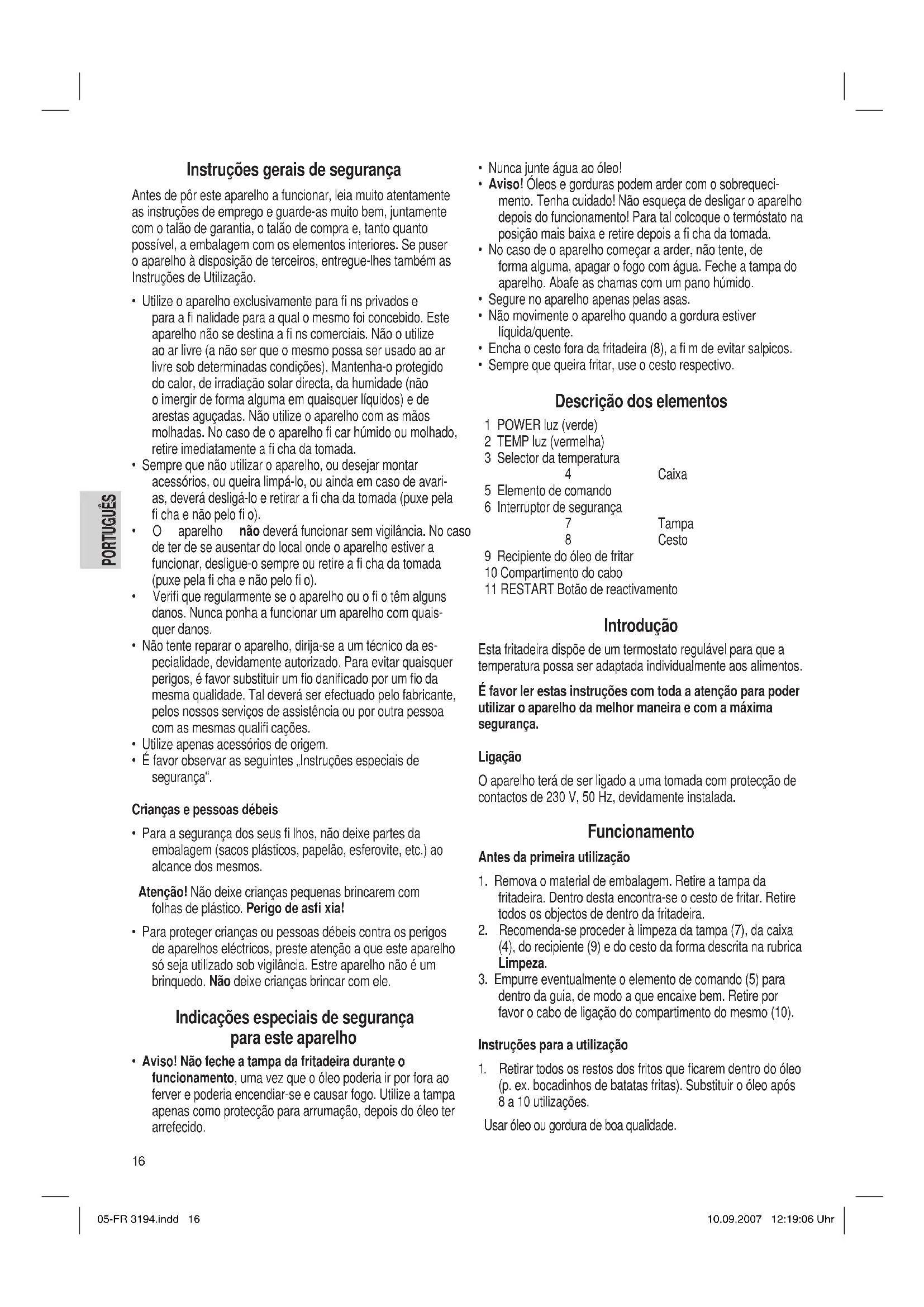 (p. ex. bocadinhos de batatas fritas). Substituir o óleo após 8 a 10 utilizações. Usar óleo ou gordura de boa qualidade. 05-FR 3194.indd 1605-FR 3194.indd 16 10.09.2007 12:19:06 Uhr10.09.2007 12:19:06 Uhr17 PORTUGUÊS PORTUGUÊS