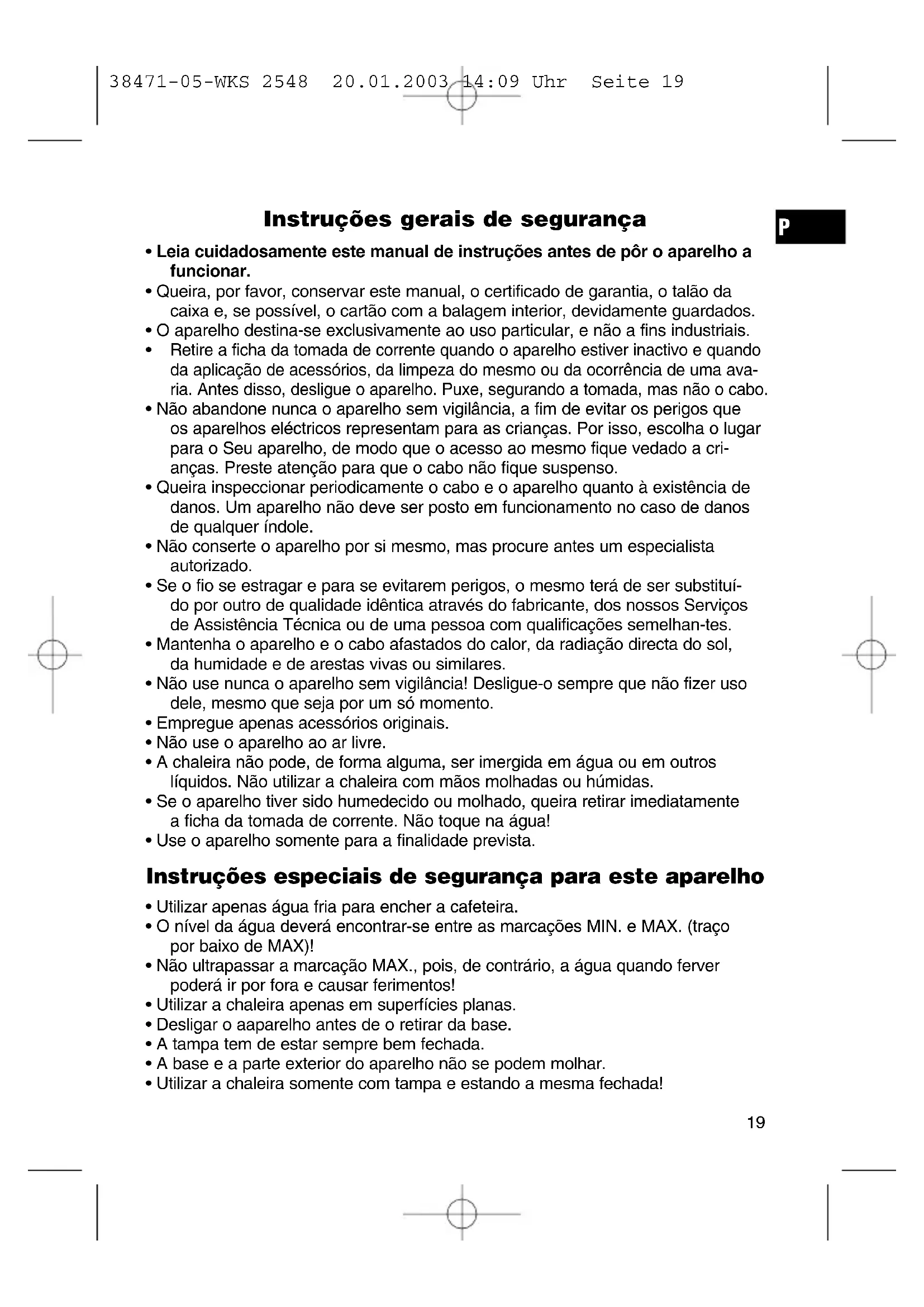 38471-05-WKS 2548 20.01.2003 14:09 Uhr Seite 20Garantia O aparelho vendido pela nossa empresa tem uma garantia de 24 meses a partir da data da compra (talão). Durante o período de garantia, procederemos à remoção grátis - quer por repa- ração, quer por substituição - de todas as deficiências do aparelho que provenham de erros de material ou de fabricação. O talão de compra consistirá prova desta garantia. Sem o mesmo, não será pos- sível proceder-se a qualquer troca ou reparação grátis. No caso de querer fazer valer a garantia, é favor entregar o aparelho completo na embalagem original, juntamente com o talão de compra, na loja onde aquele tenha sido comprado. Em caso de danos em peças de vidro ou de defeitos em quaisquer acessórios, não será efectuada a substituição do aparelho. Os mesmos serão trocados e expe- didos gratuitamente. Não enviar neste caso o aparelho para a fábrica; bastará encomendar o acessório em questão! Não estão incluídas na garantia a limpeza, a manutenção ou a troca de peças que se desgastem, devendo tais despesas ser reembolsadas. A garantia deixará de ter validade, sempre que tenha havido intervenção alheia no aparelho. Após a garantia Após a expiração do prazo de garantia, poderão ser efectuados arranjos por pes- soal especializado, ou pelos nossos serviços de reparações, contra reembolso.