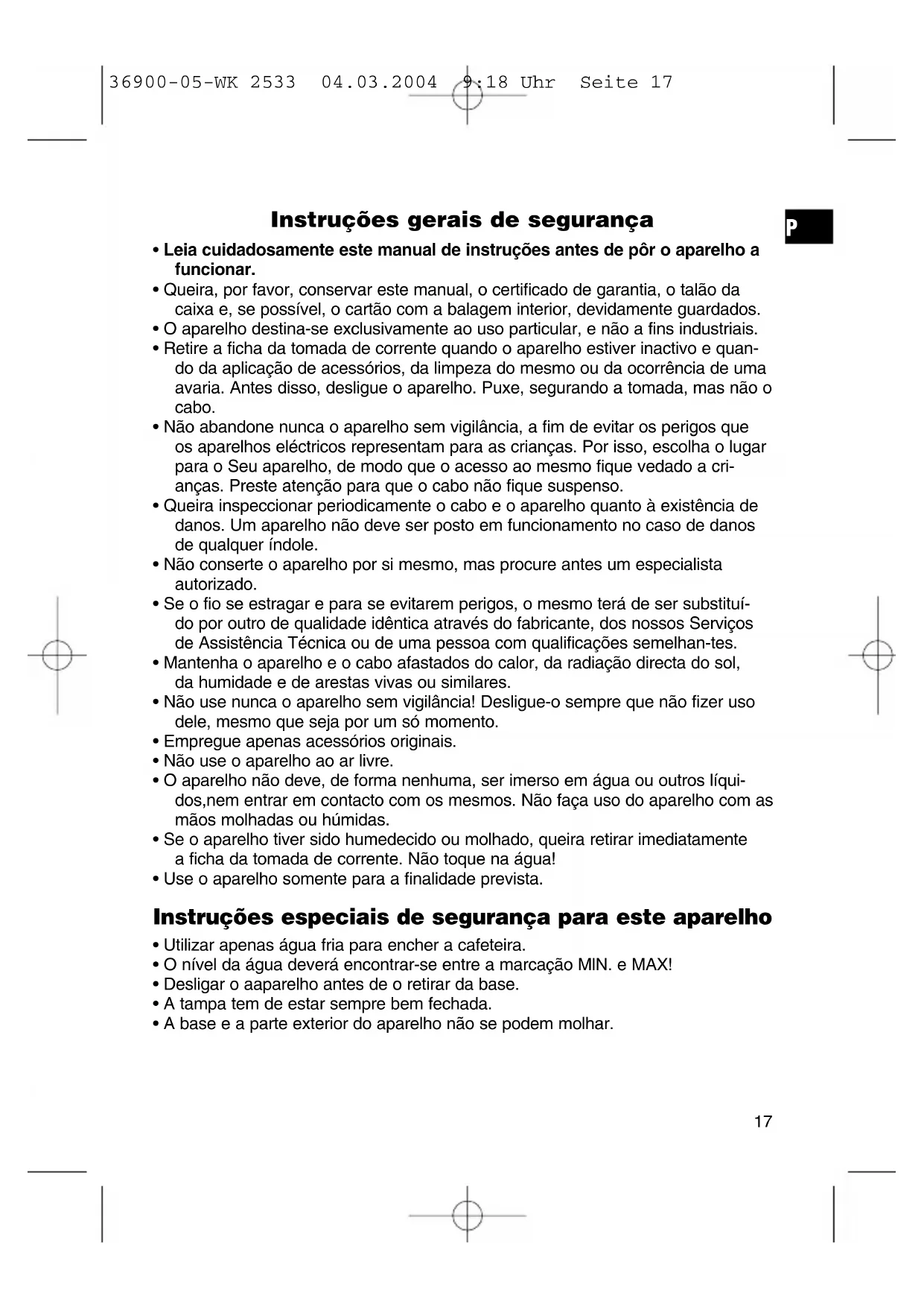 36900-05-WK 2533 04.03.2004 9:18 Uhr Seite 17Primeira utilização Antes de utilizar pela primeira a água aquecida na cafeteira, ferver 2 vezes água fresca sem aditivos e deitá-la fora.