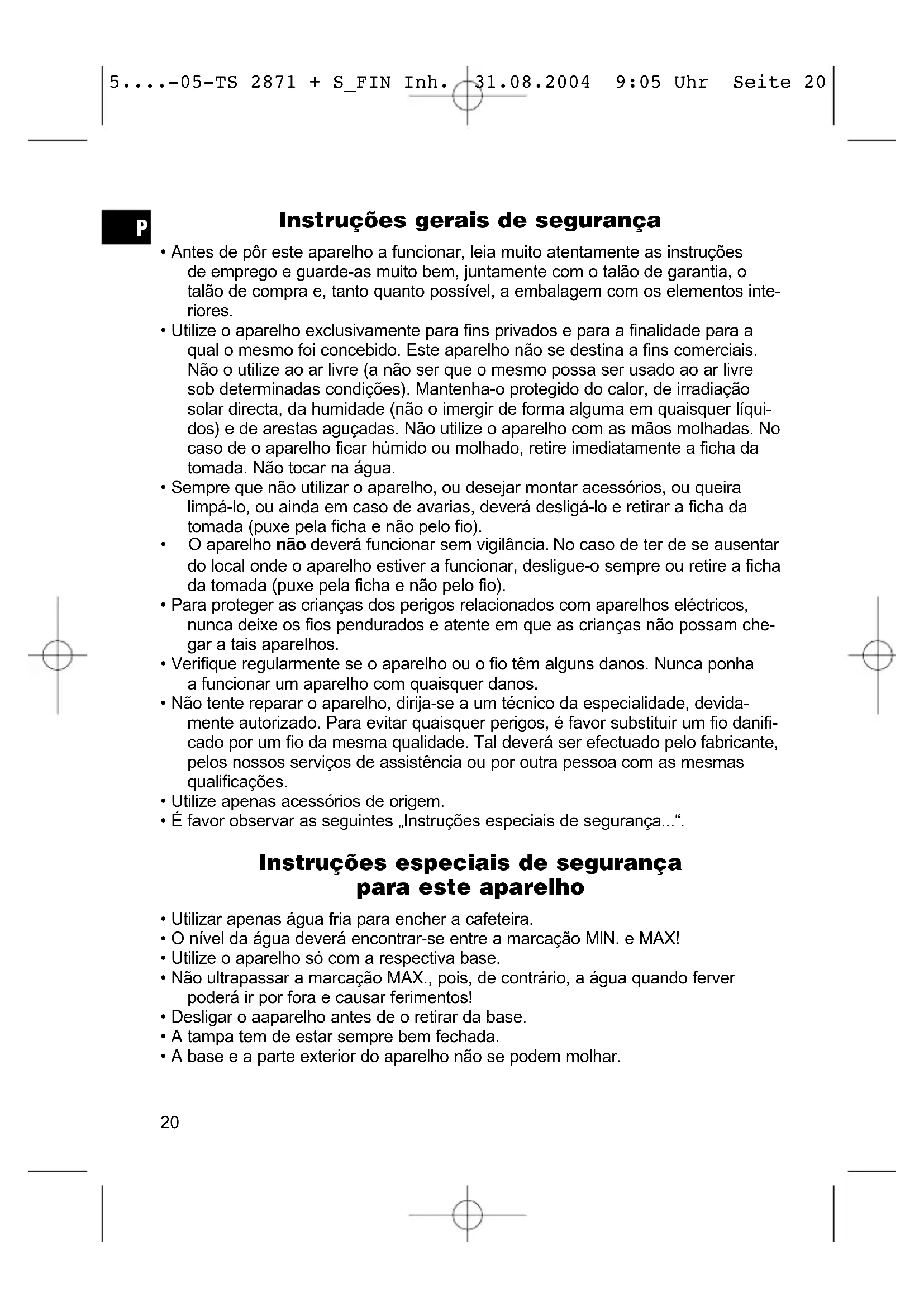5....-05-TS 2871 + S_FIN Inh. 31.08.2004 9:05 Uhr Seite 20Elementos do aparelho Base 1 Interruptor para a placa de aquecimento 2 Placa de aquecimento 3 Lâmpada de controle para a placa de aquecimento 4 Ligação para o fervedor de água 5 Fio Bule de chá 6 Tampa 7 Asa 8 Filtro de chá Fervedor de água 9 Tampa 10 Interruptor 11 Indicador do nível da água 12 Bico com filtro de calcário 13 Ligação eléctrica à base Primeira utilização Leia por favor estas instruções com toda a atenção e guarde-as num sítio seguro. Antes da primeira utilização, passe o bule por água e ferva 2 vezes água no ferve- dor. È favor usar apenas água sem quaisquer aditivos. Conexão eléctrica