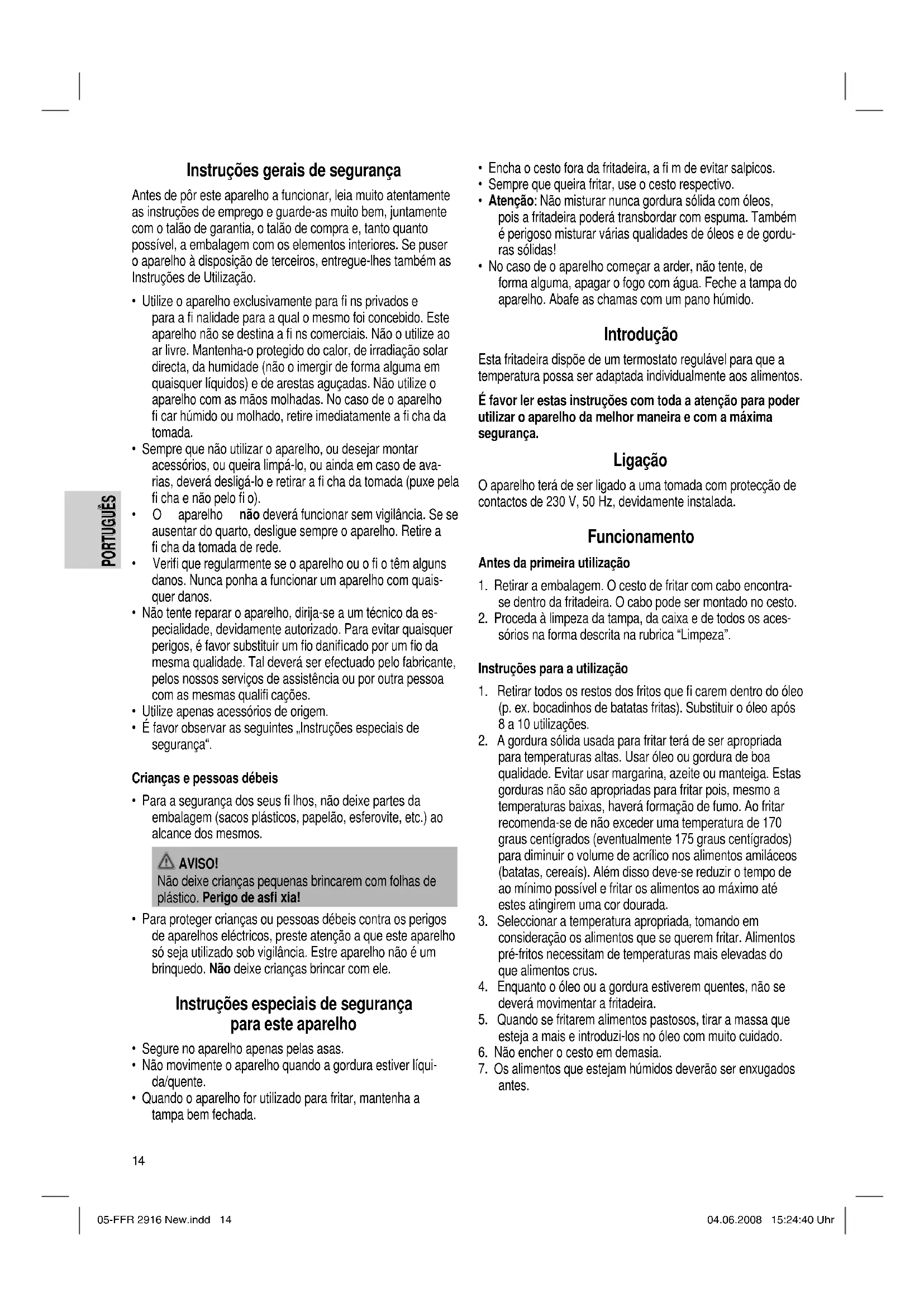antes. 05-FFR 2916 New.indd 1405-FFR 2916 New.indd 14 04.06.2008 15:24:40 Uhr04.06.2008 15:24:40 Uhr15 PORTUGUÊS PORTUGUÊS Utilização do aparelho Fritar