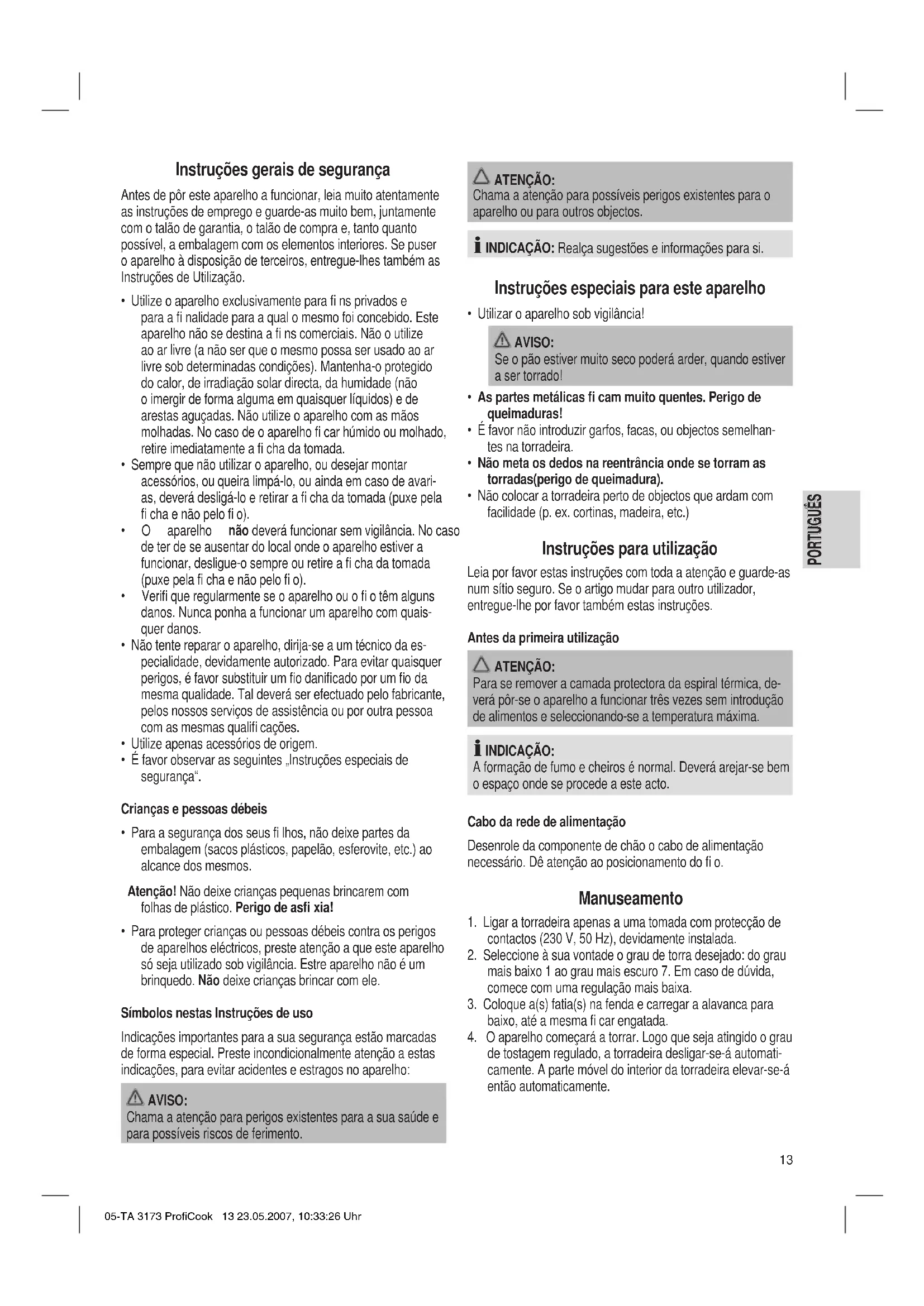 - É favor observar as seguintes „Instruções especiais de segurança“. Crianças e pessoas débeis