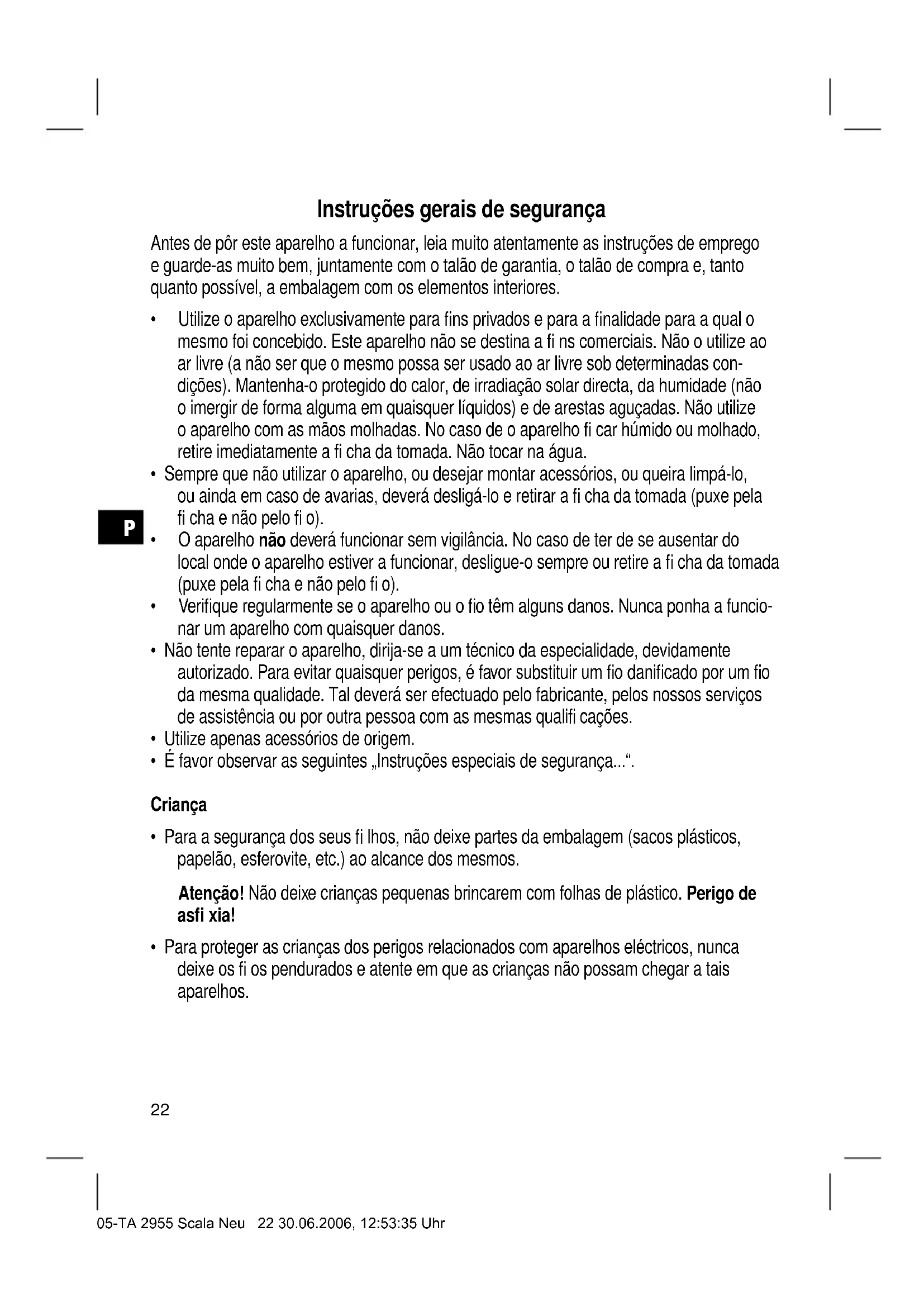 - Para proteger as crianças dos perigos relacionados com apareiros electricos, nunca deixe os fi os pendurados e atente em que as crianças não possam chegar a tais apareiros.