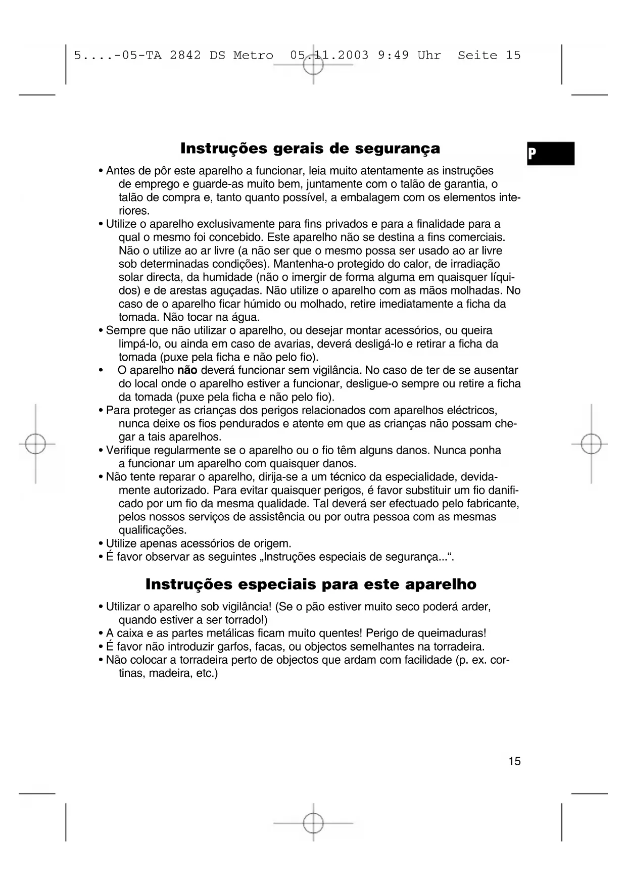 5....-05-TA 2842 DS Metro 05.11.2003 9:49 Uhr Seite 15Antes da primeira utilização Para se remover a camada protectora da espiral térmica, deverá pôr-se o aparelho a funcionar três vezes sem introdução de alimentos e seleccionando-se a tempera- tura máxima. A formação de fumo e cheiros é normal. Deverá arejar-se bem o espaço onde se procede a este acto. Manuseamento