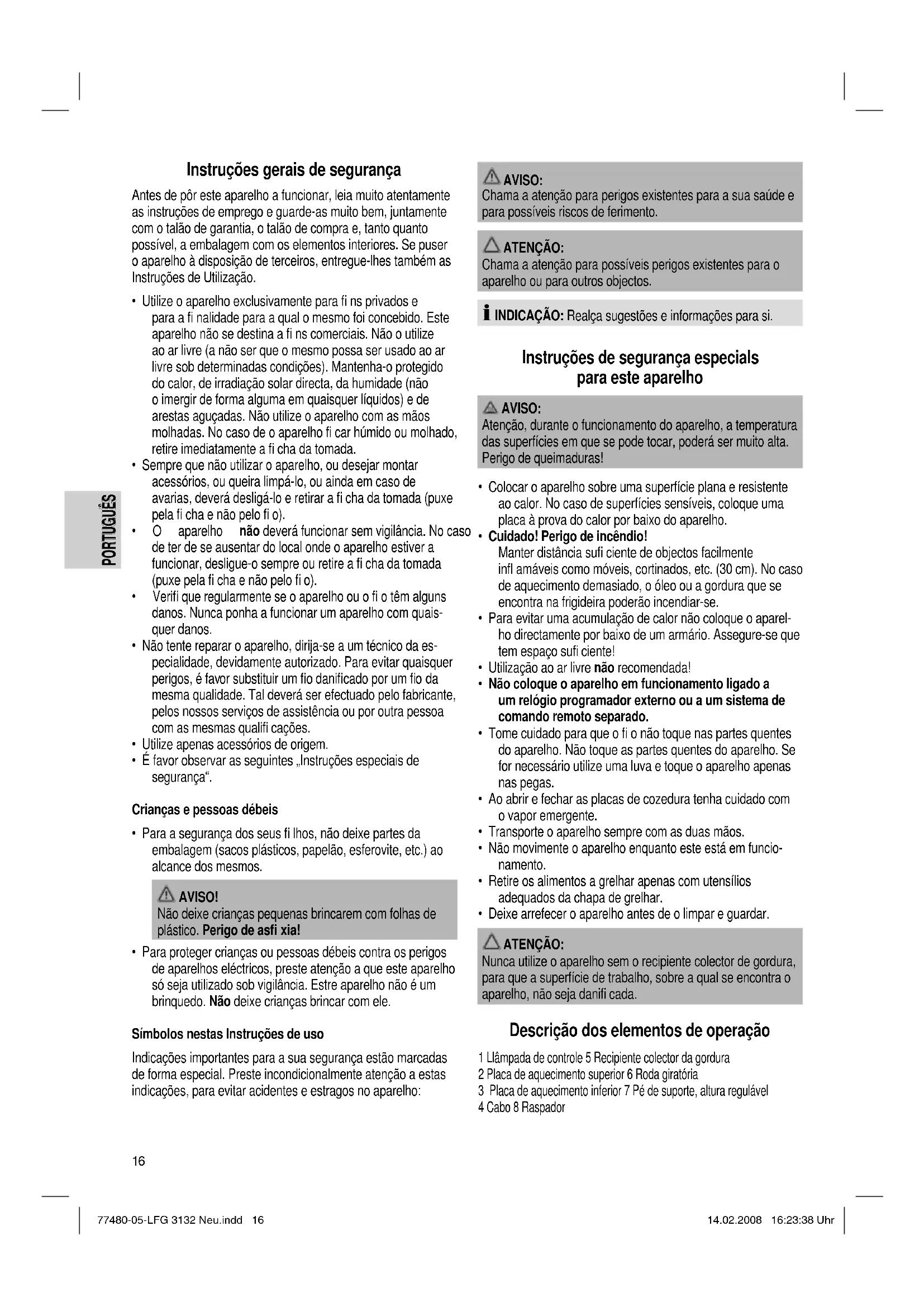 - Deixe arrefecer o aparelho antes de o limpar e guardar. ATENÇÃO: Nunca utilize o aparelho sem o recipiente colector de gordura, para que a superfície de trabalho, sobre a qual se encontra o aparelho, não seja danifi cada. Descrição dos elementos de operação 1 Llâmpada de controle 5 Recipiente colector da gordura 2 Placa de aquecimento superior 6 Roda giratória 3 Placa de aquecimento inferior 7 Pé de suporte, altura regulável 4 Cabo 8 Raspador 77480-05-LFG 3132 Neu.indd 1677480-05-LFG 3132 Neu.indd 16 14.02.2008 16:23:38 Uhr14.02.2008 16:23:38 Uhr17 PORTUGUÊS PORTUGUÊS Primeira utilização do aparelho Revestimento antiaderente