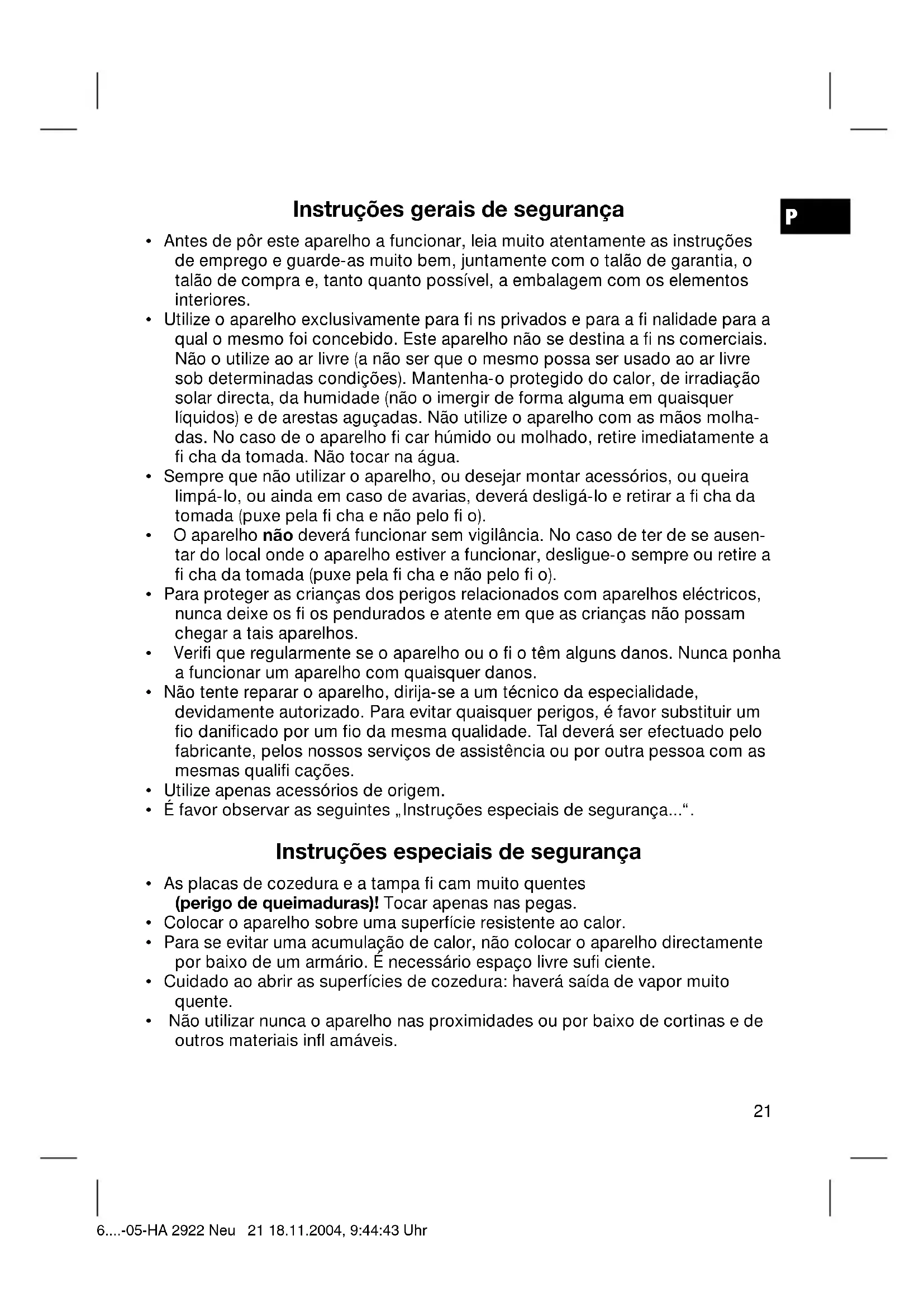 - Não utilizar nunca o aparelho nas proximidades ou por baixo de cortinas e de outros materiais infl amáveis. 6....-05-HA 2922 Neu 21 18.11.2004, 9:44:43 UhrP