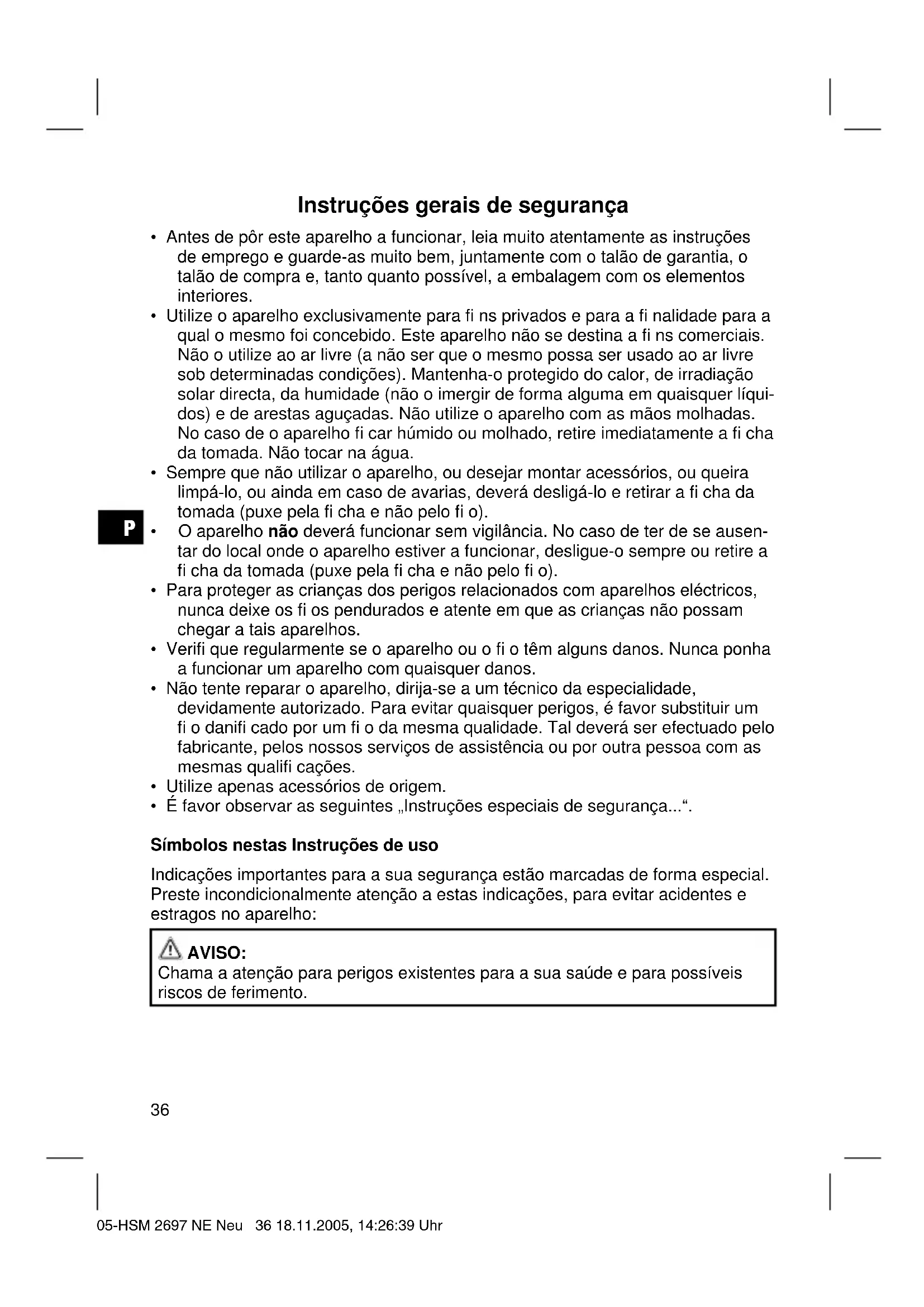 - É favor observar as seguintes „Instruções especiais de segurança...“. Símbolos nestas Instruções de uso Indicações importantes para a sua segurança estão marcadas de forma especial. Preste incondicionalmente atenção a estas indicações, para evitar acidentes e estragos no aparelho: AVISO: Chama a atenção para perigos existentes para a sua saúde e para possíveis riscos de ferimento. 05-HSM 2697 NE Neu 36 18.11.2005, 14:26:39 UhrP
