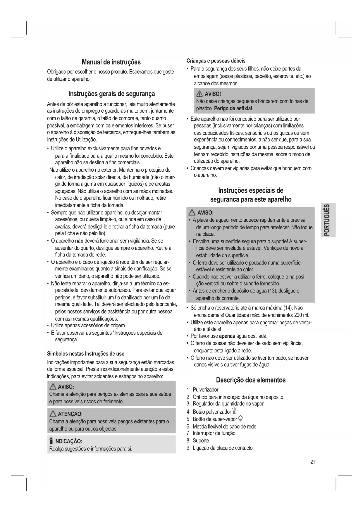 - É favor observar as seguintes “Instruções especiais de segurança“. Símbolos nestas Instruções de uso Indicações importantes para a sua segurança estão marcadas de forma especial. Preste incondicionalmente atenção a estas indicações, para evitar acidentes e estragos no aparelho: AVISO: Chama a atenção para perigos existentes para a sua saúde e para possíveis riscos de ferimento. ATENÇÃO: Chama a atenção para possíveis perigos existentes para o aparelho ou para outros objectos. INDICAÇÃO: Realça sugestões e informações para si. Crianças e pessoas débeis