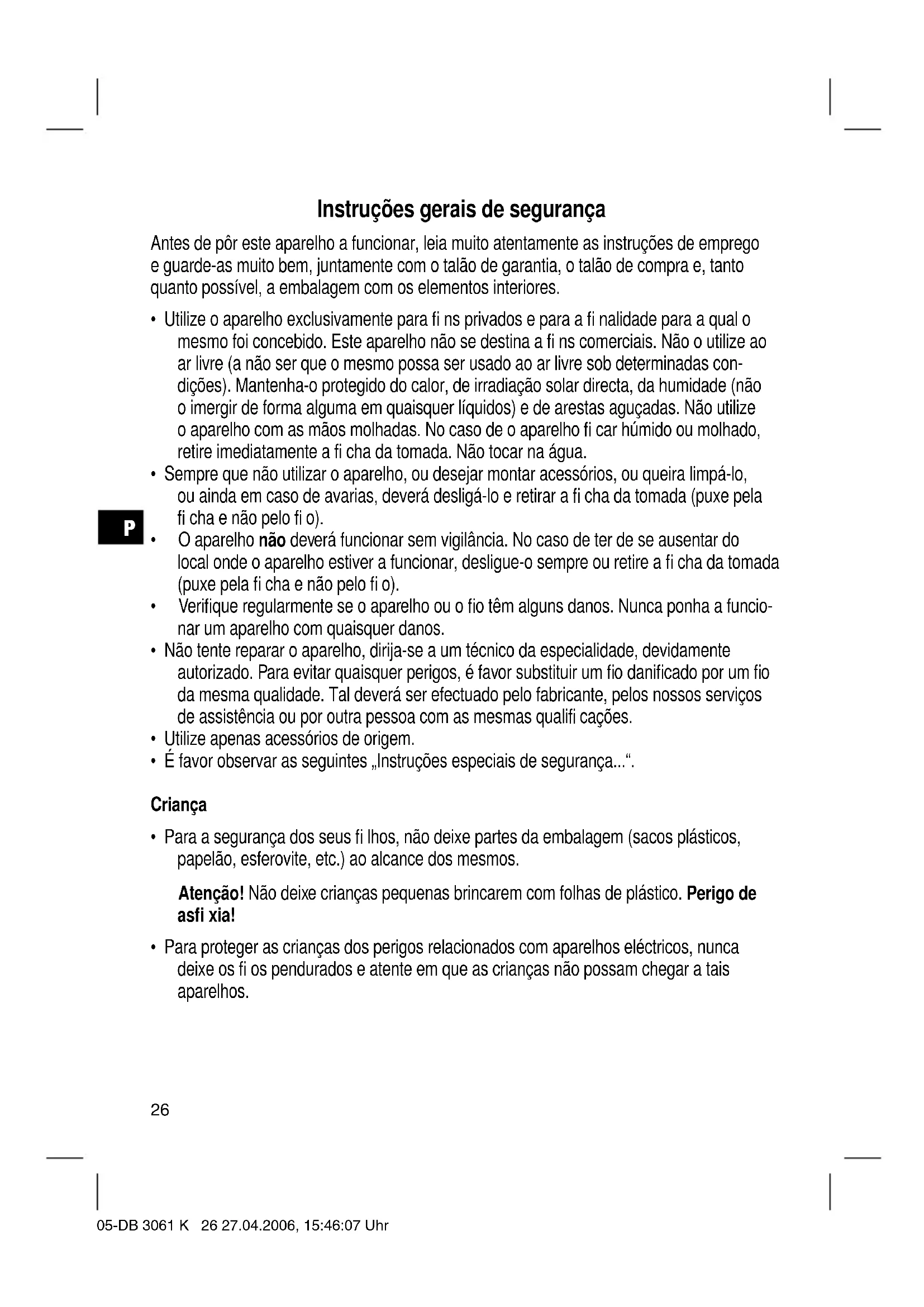 - Para proteger as crianças dos perigos relacionados com aparelhos eléctricos, nunca deixe os fi os pendurados e atente em que as crianças não possam chegar a tais aparelhos. 05-DB 3061 K 26 27.04.2006, 15:46:07 UhrP