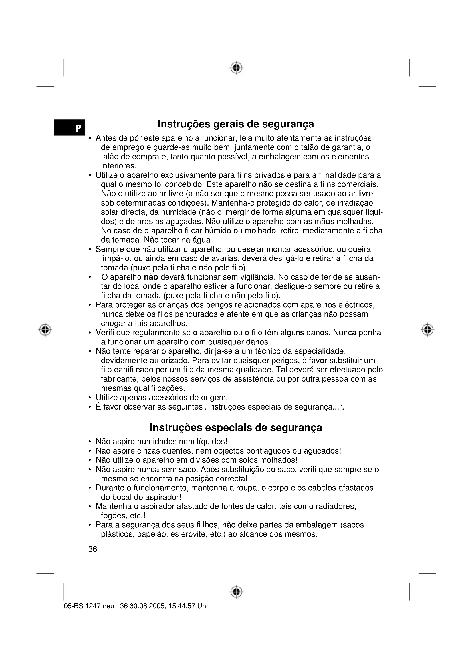 - Para a segurança dos seus fi lhos, não deixe partes da embalagem (sacos plásticos, papelão, esferovite, etc.) ao alcance dos mesmos. 05-BS 1247 neu 36 30.08.2005, 15:44:57 UhrP