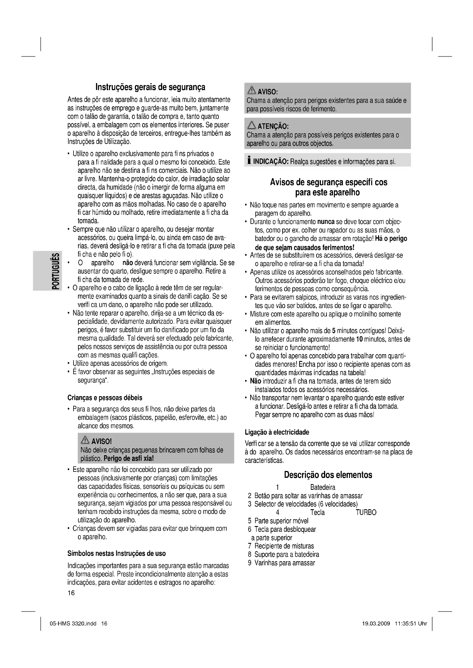 - Não transportar nem levantar o aparelho quando este estiver a funcionar. Desligá-lo antes e retirar a fi cha da tomada. Pegar sempre no aparelho com as duas mãos! Ligação à electricidade Verifi car se a tensão da corrente que se vai utilizar corresponde à do aparelho. Os dados necessários encontram-se na placa de características. Descrição dos elementos 1 Batedeira 2 Botão para soltar as varinhas de amassar 3 Selector de velocidades (6 velocidades) 4 Tecla TURBO 5 Parte superior móvel 6 Tecla para desbloquear a parte superior 7 Recipiente de misturas 8 Suporte para a batedeira 9 Varinhas para amassar 05-HMS 3320.indd 1605-HMS 3320.indd 16 19.03.2009 11:35:51 Uhr19.03.2009 11:35:51 Uhr17 PORTUGUÊS PORTUGUÊS Funcionamento turbo Para obter momentaneamente o número máximo de rotações. Carregando a tecla em intervalos curtos, consegue-se uma operação intermitente. ATENÇÃO: Não utilizar esta função mais de 1 minuto! Utilização das varinhas para amassar/bater