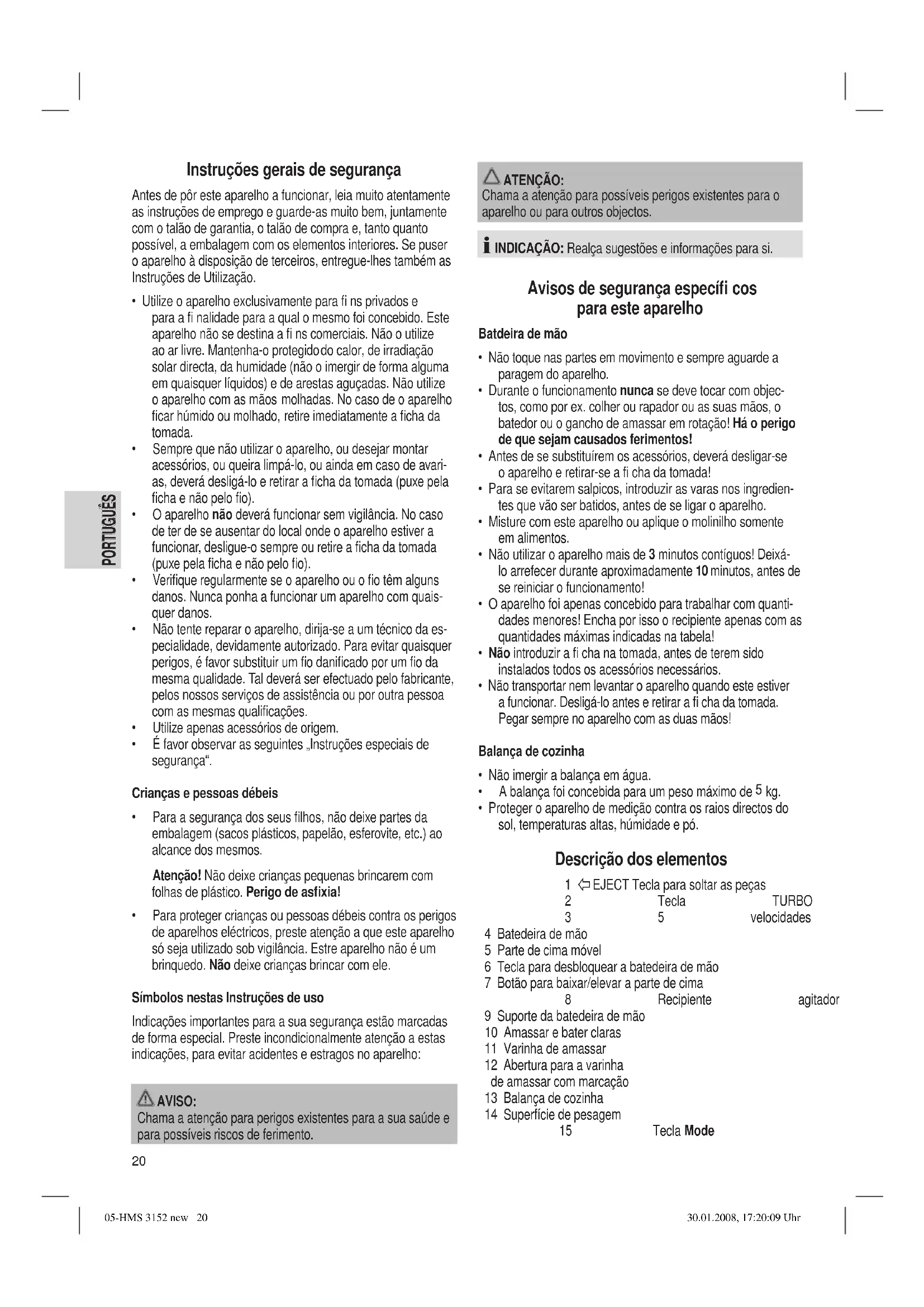 EJECT Tecla para soltar as peças 2 Tecla TURBO 3 5 velocidades 4 Batedeira de mão 5 Parte de cima móvel 6 Tecla para desbloquear a batedeira de mão 7 Botão para baixar/elevar a parte de cima 8 Recipiente agitador 9 Suporte da batedeira de mão 10 Amassar e bater claras 11 Varinha de amassar 12 Abertura para a varinha de amassar com marcação 13 Balança de cozinha 14 Superfície de pesagem 15 Tecla Mode 05-HMS 3152 new 20 30.01.2008, 17:20:09 Uhr21 PORTUGUÊS PORTUGUÊS 16 Tecla TARE (tare) 17 Tecla ON/OFF (ligado/desligado) 18 Display LCD Desembalar o aparelho
