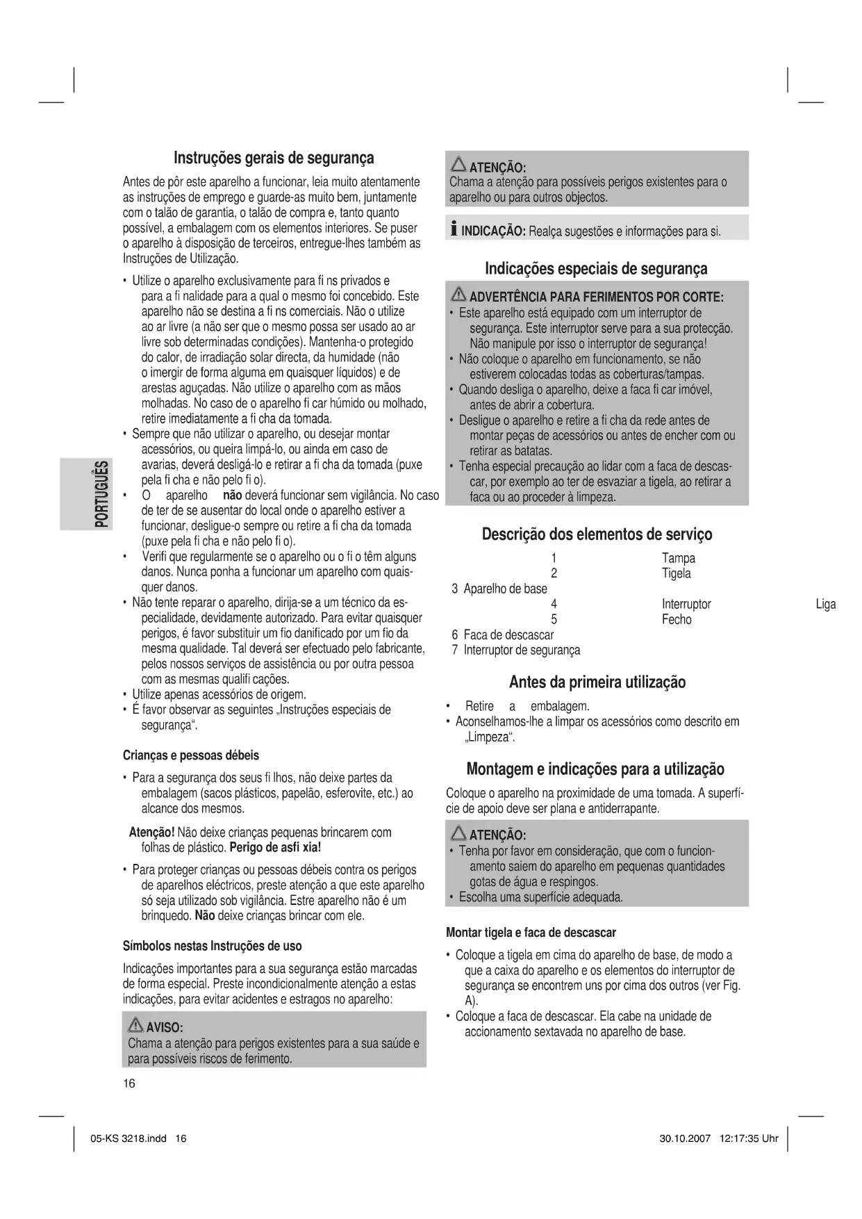 - É favor observar as seguintes „Instruções especiais de segurança“. Crianças e pessoas débeis