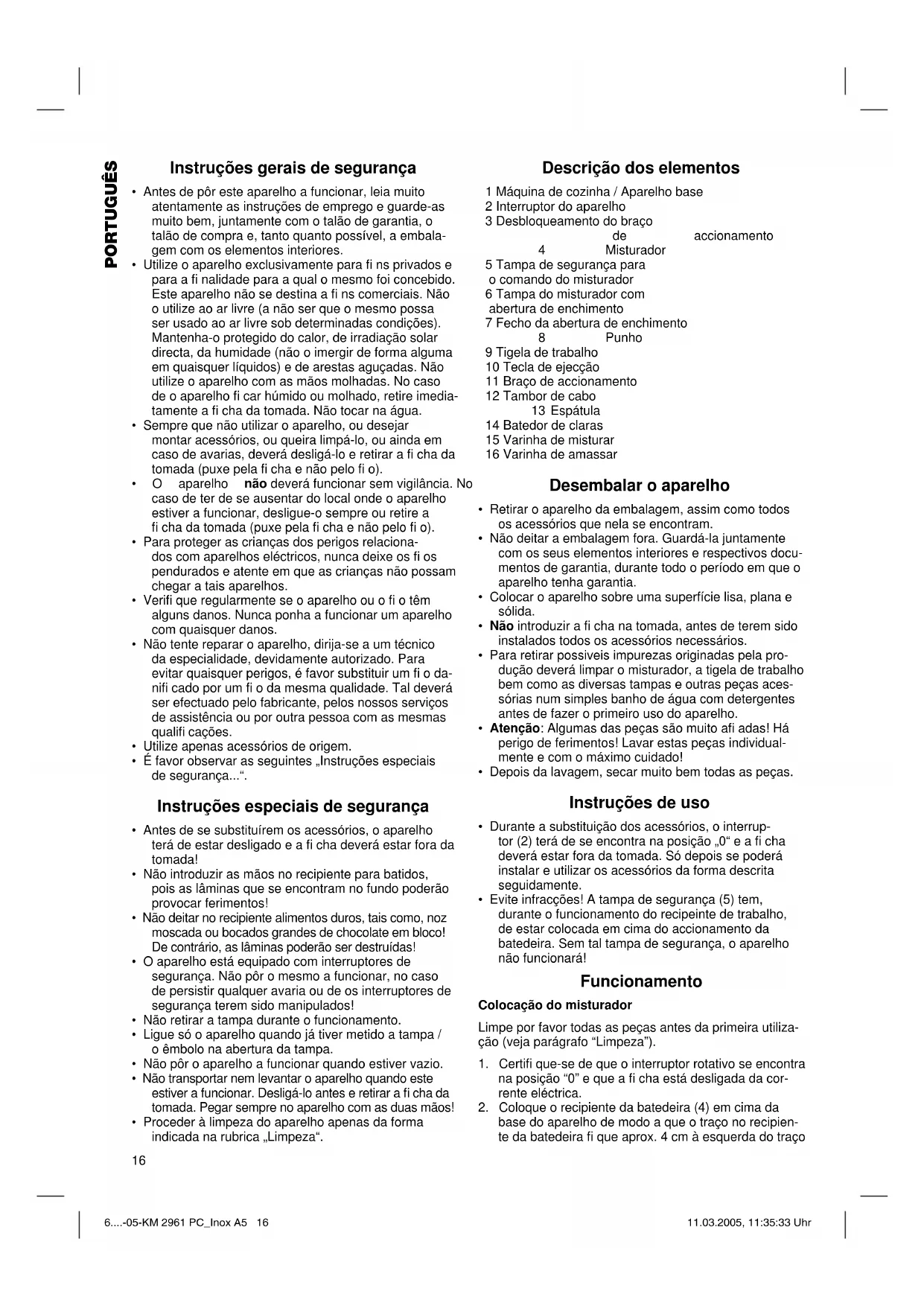 base do aparelho de modo a que o traço no recipien- te da batedeira fi que aprox. 4 cm à esquerda do traço 6....-05-KM 2961 PC_Inox A5 16 11.03.2005, 11:35:33 Uhr17 PORTUGUÊS na base do aparelho. Rode então o recipiente da batedeira (4) no sentido dos ponteiros do relógio, até ambos os traços coincidirem. Funcionamento do misturador Atenção interruptor de segurança! O aparelho só fun- ciona, quando o recipiente da batedeira (4) está colocado em cima da caixa do motor.