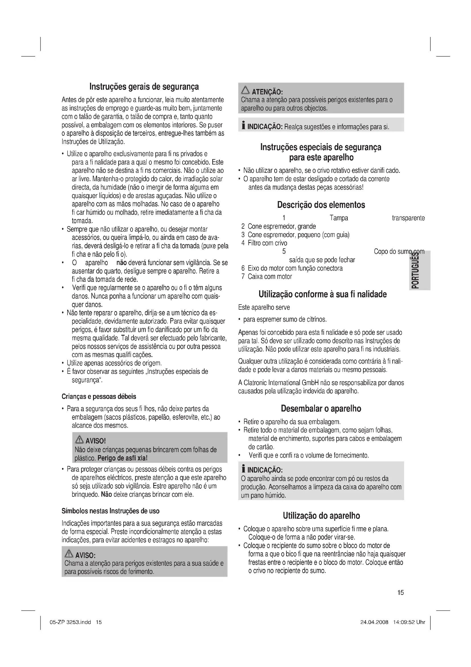 ZP 3253 - Espremedor de sucos CLATRONIC - Manual de utilização gratuito