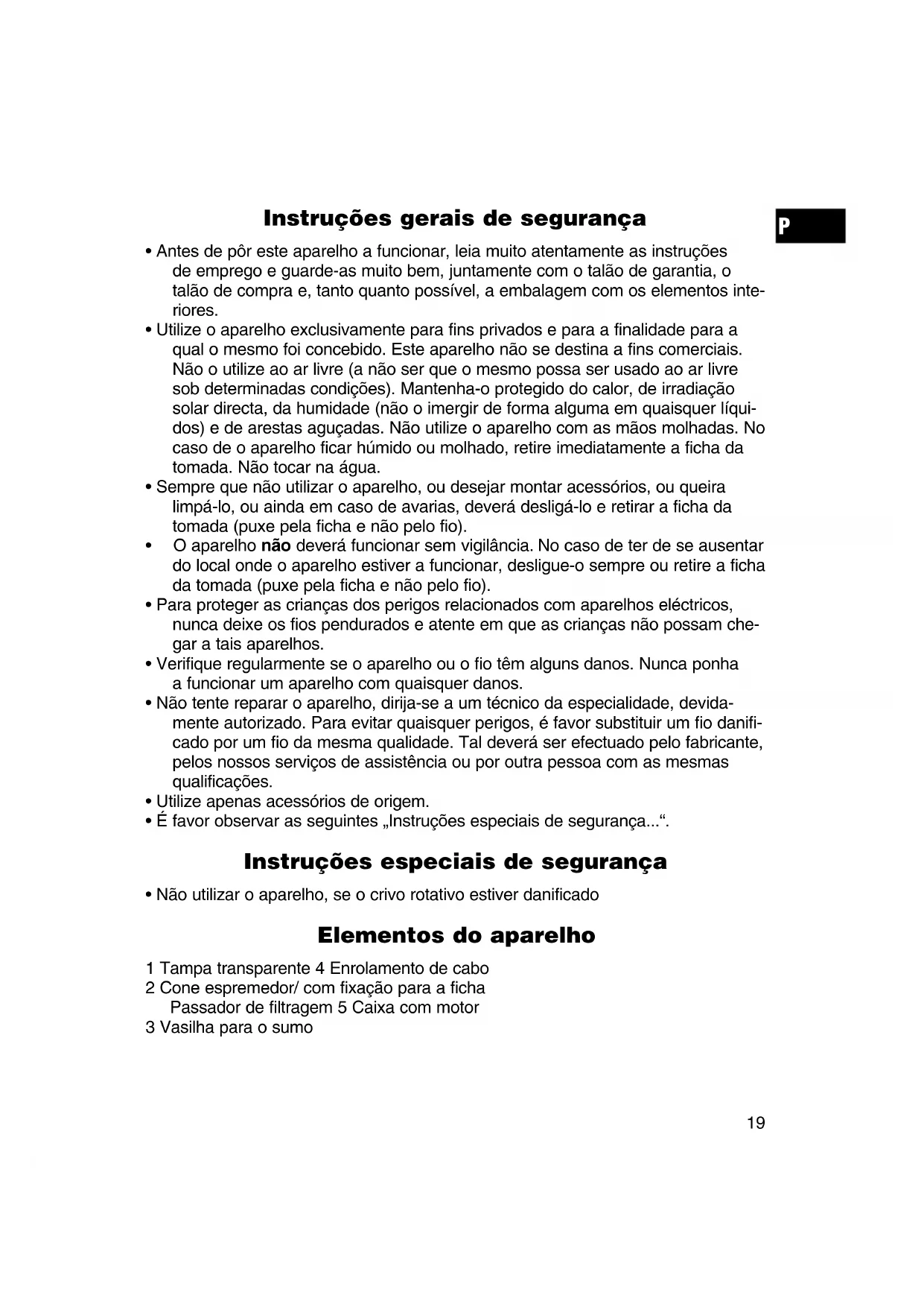 - Não utilizar o aparelho, se o crivo rotativo estiver danificado Elementos do aparelho 1 Tampa transparente 4 Enrolamento de cabo 2 Cone espremedor/ com fixação para a ficha Passador de filtragem 5 Caixa com motor 3 Vasilha para o sumo