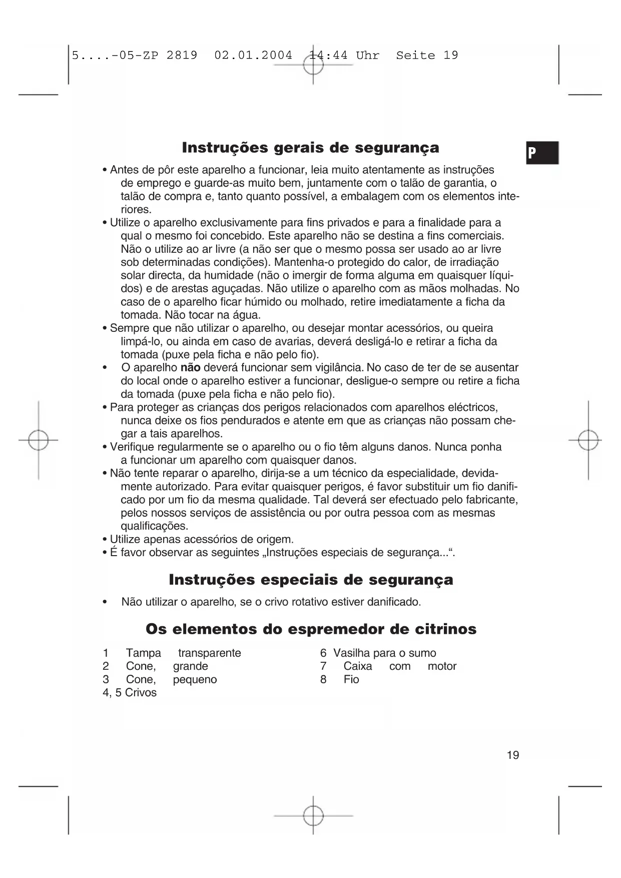 1 Tampa transparente 2 Cone, grande 3 Cone, pequeno 4, 5 Crivos 6 Vasilha para o sumo 7 Caixa com motor 8 Fio 5....-05-ZP 2819 02.01.2004 14:44 Uhr Seite 19Primeira utilização