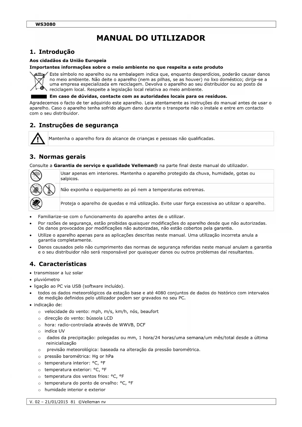 Encontre gratuitamente o manual do aparelho WS3080 VELLEMAN em formato PDF.