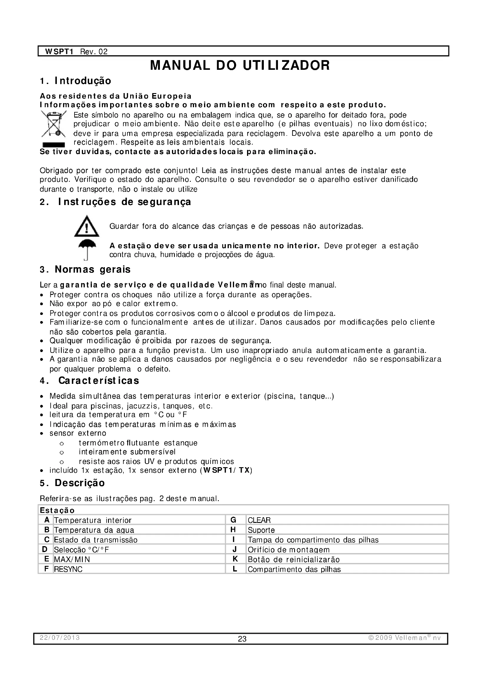 Encontre gratuitamente o manual do aparelho WSPT1 VELLEMAN em formato PDF.