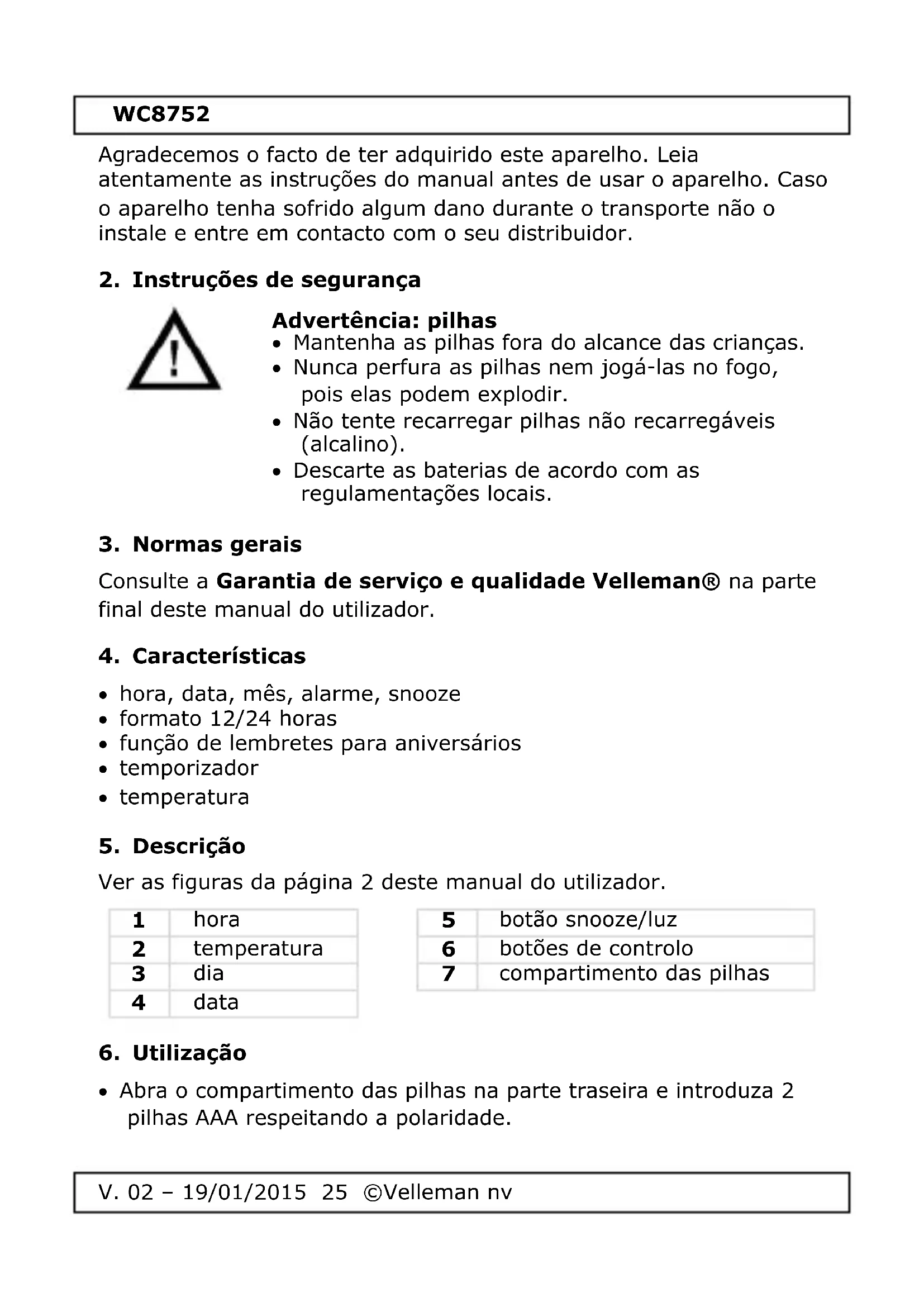 Encontre gratuitamente o manual do aparelho WC8752 VELLEMAN em formato PDF.