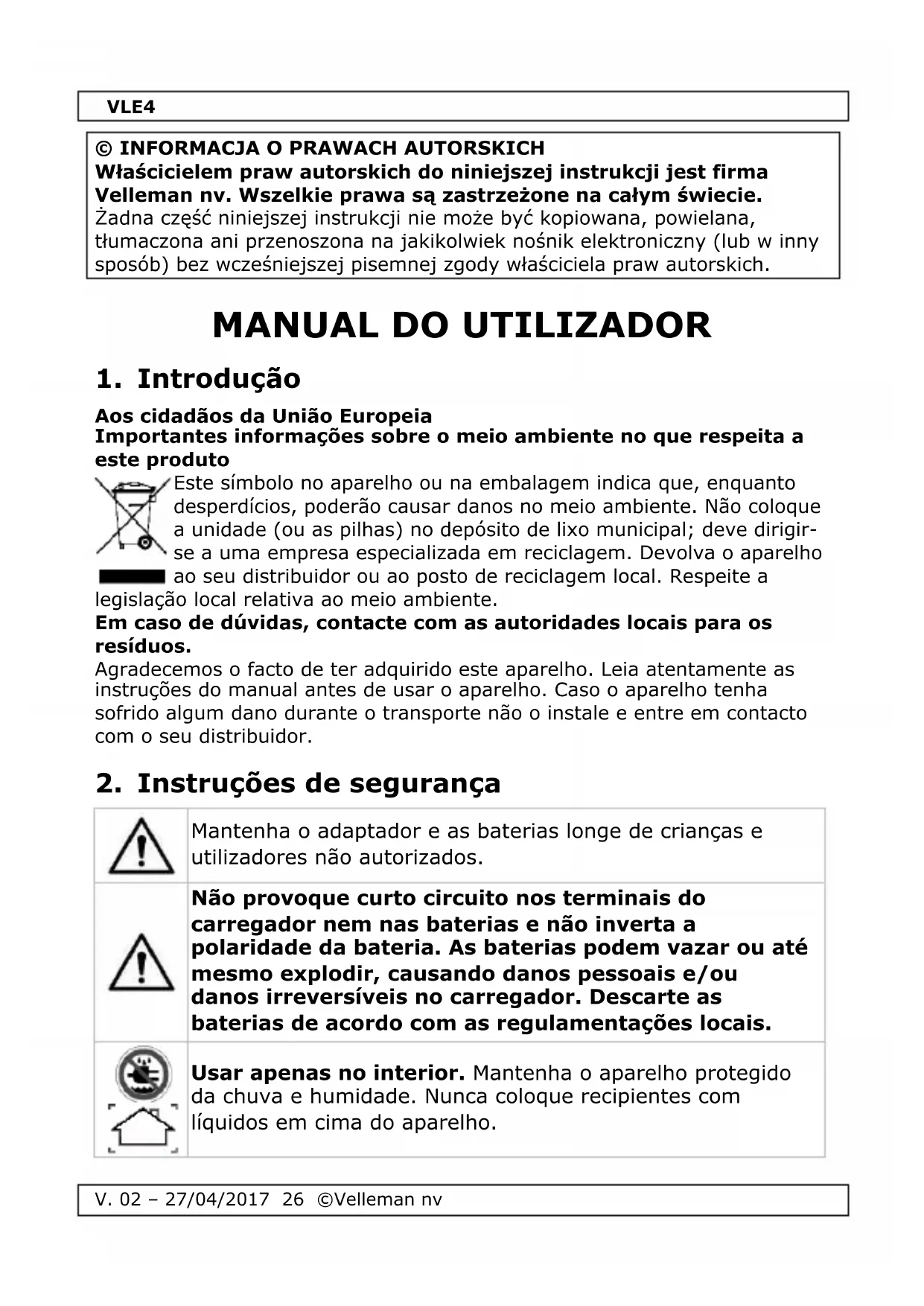 Encontre gratuitamente o manual do aparelho VLE4 VELLEMAN em formato PDF.