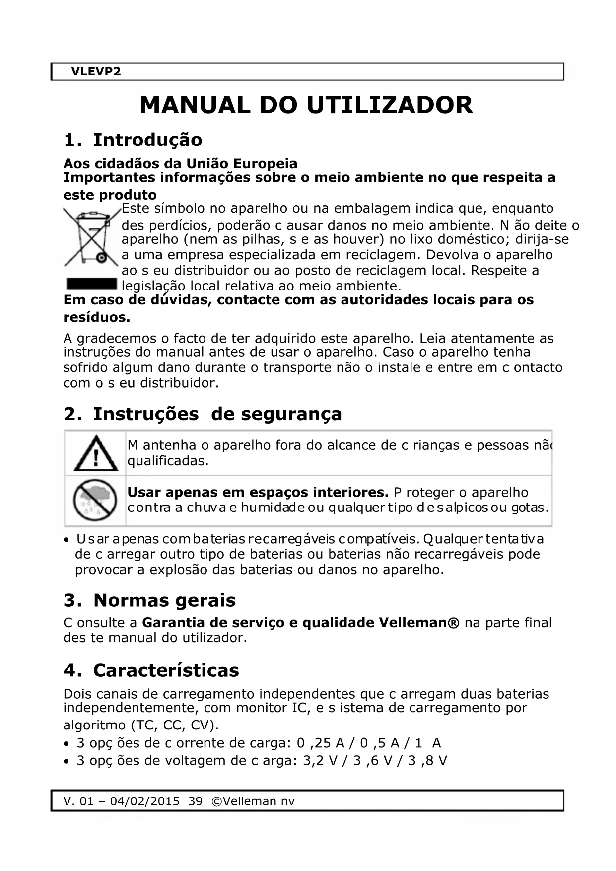 Baixe as instruções para o seu Carregador de pilhas em formato PDF gratuitamente! Encontre o seu manual VLEVP2 - VELLEMAN e retome o controlo do seu dispositivo eletrónico. Nesta página estão publicados todos os documentos necessários para a utilização do seu dispositivo. VLEVP2 da marca VELLEMAN.