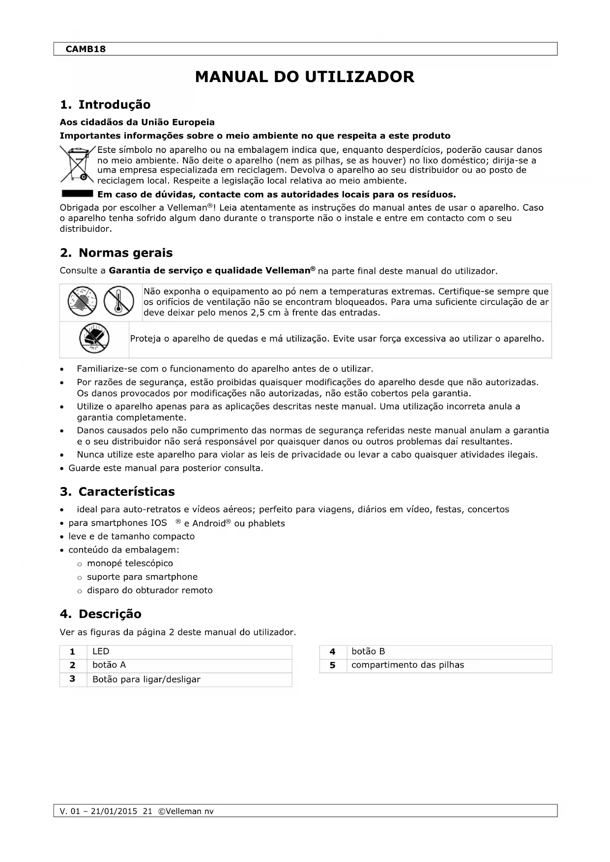 Baixe as instruções para o seu Tripé em formato PDF gratuitamente! Encontre o seu manual CAMB18 - VELLEMAN e retome o controlo do seu dispositivo eletrónico. Nesta página estão publicados todos os documentos necessários para a utilização do seu dispositivo. CAMB18 da marca VELLEMAN.