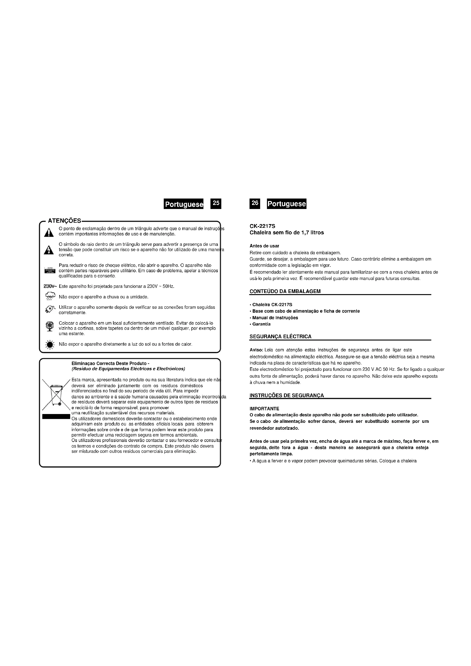 Fig. 1 Español Español 23 24ATENÇÕES O ponto de exclamação dentro de um triãngulo adverte que o manual de instruções contém importantes informações de uso e de manutenção. O simbolo do raio dentro de um triãngulo serve para advertir a presença de uma tensão que pode constituir um risco se o aparelho não for utilizado de uma maneira correta. Para reduzir o risco de choque elétrico, não abrir o aparelho. O aparelho não contém partes reparáveis pelo utilitário. Em caso de problema, apelar a técnicos qualificados para o conserto. Este aparelho foi projetado para funcionar a 230V ~ 50Hz. Não expor o aparelho a chuva ou a umidade. Utilizar o aparelho somente depois de verificar se as conexões foram seguidas corretamente. Colocar o aparelho em um local suficientemente ventilado. Evitar de colocá-lo vizinho a cortinas, sobre tapetes ou dentro de um móvel qualquer, por exemplo uma estante. Não expor o aparelho diretamente a luz do sol ou a fontes de calor. Eliminaçao Correcta Deste Produto - (Resíduo de Equipamentas Eléctricos e Electrónicos) Esta marca, apresentada no produto ou na sua literatura indica que ele não deverá ser eliminado juntamente com os residuos domésticos indiferenciados no final do seu periodo de vida útil. Para impedir danos ao ambiente e á saúde humana causados pela eliminação incontrolada de resíduos deverá separar este equipamento de outros tipos de residuos e reciclá-lo de forma responsável, para promover uma reutilização sustentável dos recursos materiais. Os utilizadores domesticos deverão contactar ou o estabelecimento onde adquiriram este produto ou as entidades oficiais locais para obterem informaçães sobre onde e de que forma podem levar este produto para permitir efectuar uma reciclagem segura em termos ambientais. Os utilizadores profissionais deverão contactar o seu fornecedor e consultar os termos e condições do contrato de compra. Este produto não devera ser misturado com outros residuos comerciais para eliminação. CK-2217S Chaleira sem fio de 1,7 litros Antes de usar Retire com cuidado a chaleira da embalagem. Guarde, se desejar, a embalagem para uso futuro. Caso contrário elimine a embalagem em conformidade com a legislação em vigor. É recomendado ler atentamente este manual para familiarizar-se com a nova chaleira antes de usá-lo pela primeira vez. É recomendável guardar este manual para futuras consultas.