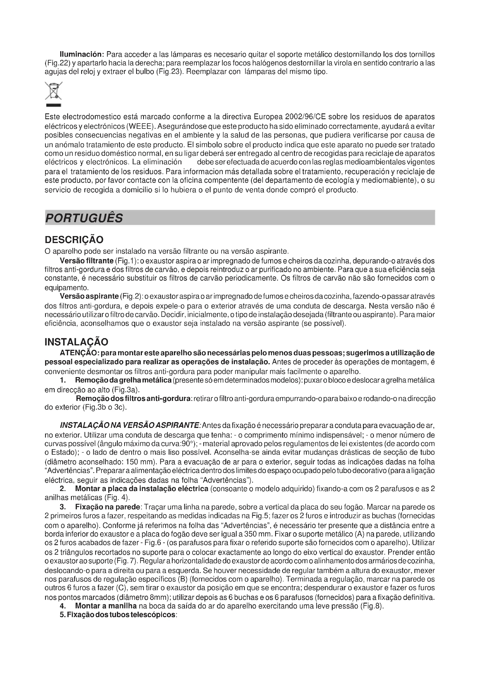 5. Fixação dos tubos telescópicos:5a - Montar o suporte tubo utilizando os 4 parafusos em dotação (Fig.9); fixar depois o suporte no tecto com as buchas e parafusos (F) fornecidos, sobre o eixo de simetria vertical do exaustor (Fig.10). 5b - Ligar a conduta para evacuação do ar à boca de saída de ar do exaustor; utilizar um tubo flexível e fixá-lo à boca de saída de ar com uma braçadeira metálica - Fig.11 - (o tubo e a braçadeira não são fornecidos com aparelho). Para a versão aspirante, inverter o tubo superior de maneira a fazer com que as grelhas de evacuação de ar fiquem para baixo (Fig.12). 5c - Fazer a ligação eléctrica do exaustor ligando o cabo de alimentação. Inserir os tubos telescópicos apoiando-os por cima do exaustor; levantar o tubo superior até ao tecto e fixá-lo com os 2 parafusos (H) - Fig.13. INSTALAÇÃO NA VERSÃO FILTRANTE: Preparar a alimentação eléctrica dentro dos limites do espaço ocupado pelo tubo decorativo (para a ligação eléctrica, seguir as indicações dadas na folha “Advertências”). Fixação à parede: para a fixação à parede, começar por seguir as instruções dadas para a versão aspirante (ver pontos 2, 3, 4) e depois prosseguir de acordo com as instruções que damos abaixo. Fixação dos tubos telescópicos: - Montar o suporte tubo utilizando os 4 parafusos em dotação (Fig.9); - Fixar depois o suporte no tecto com as buchas e parafusos (F) fornecidos, colocando-o sobre o eixo de simetria vertical do exaustor (Fig. 10). - Montar a redução por cima do exaustor, na posição correspondente ao ponto de saída de ar (Fig.14). - Agarrar no deflector de ar e fixar nele um tubo flexível (com 125 mm de diâmetro), imobilizando-o com uma braçadeira metálica (o tubo e as braçadeiras não são fornecidos com o exaustor); fixar o deflector de ar ao tubo superior (Fig.15) com 4 parafusos. - Ligar o tubo flexível à redução existente na boca de saída de ar (Fig.16). - Fazer a ligação eléctrica do exaustor ligando o cabo de alimentação. - Inserir os tubos telescópicos apoiando-os por cima do exaustor; levantar o tubo superior até ao tecto e fixá-lo com os 2 parafusos H (Fig.13). - Montar o filtro de carvão introduzindo as 2 linguetas do filtro na respectiva sede (Fig.17) e rodando-o para cima. FUNCIONAMENTO Os comandos variam de acordo com a versão do aparelho. Os tipos de comandos existentes são os seguintes: COMANDOS da Fig.18: A) Desliga as LUZES. B) Acende as LUZES. C) Reduz a velocidade até atingir a velocidade mínima. Se pressionado durante 2" desliga-se o motor. D) Acciona o motor (lembrando a última velocidade utilizada) e aumenta a velocidade até chegar à máxima. E) RESET ALARME FILTROS/TEMPORIZADOR: pressionando a tecla durante a visualização do alarme filtros (com o motor desligado) reinicia a contagem das horas. Pressionando a tecla durante o funcionamento do motor, activa-se o TEMPORIZADOR, razão pela qual o exaustor desliga-se automaticamente após 5 minutos. L1) Os 4 LED VERDES indicam a velocidade em execução. L2) Quando o LED é vermelho (com o motor desligado) indica o ALARME FILTROS. Quando o LED é verde (intermitente) indica que foi accionado o TEMPORIZADOR através da tecla E. ALARME DOS FILTROS: Ao fim de 30h de funcionamento, o Led L2 passa a VERMELHO. indica que os filtros anti-gordura devem ser limpos. Ao fim de 120h de funcionamento o Led L2 passa a VERMELHO intermitente; indica que os filtros anti-gordura devem ser limpos e os filtros de carvão devem ser substituídos. Terminada a limpeza dos filtros anti-gordura (e/ou substituídos os filtros de carvão), para reiniciar a contagem das horas (RESET) premir a tecla E durante a visualização do alarme dos filtros. COMANDOS da Fig.19: P1) OFF/- Luz: Diminui a intensidade luminosa até atingir o mínimo. Se for premido por 2", as luzes apagam-se. P2) ON/+ Luzes: Acende as luzes com a intensidade do último nível de luminosidade programado (o mesmo que tinham antes de terem sido desligadas pela última vez). Aumenta a intensidade luminosa até atingir o máximo. P3) OFF/- Motor: Diminui a velocidade até atingir a velocidade mínima. Se for premido por 2", o motor desliga-se. Se for premido por 2"com o ALARME FILTROS activo, põe o contador de HORAS a zero. P4) ON/+ Motor: Liga o motor com a mesma velocidade da última programada (a mesma que tinha antes de ter sido desligado pela última vez). Aumenta a velocidade do motor até atingir a velocidade máxima (NÃO INTENSIVAS). Se for premido por 2", activa-se o Timer de 5 minutos, facto SINALIZADO através da luz intermitente emitida pelos leds correspondentes à velocidade em execução. Se for premido por 2" com o Timer activo , faz com que este último seja ELIMINADO. P5) INT: Só funciona com o MOTOR em ON (ligado). Se for premido uma vez activa a PRIMEIRA intensiva, duas vezes activa a SEGUNDA intensiva, TRÊS vezes retoma a velocidade que estava definida antes da intensiva (ou seja, uma das 4 primeiras). L1) Os 4 LED VERDES indicam a velocidade em execução. L2) Led Bicolor: VERDE = indica primeira velocidade intensiva. VERMELHO = indica segunda velocidade intensiva. ALARME DOS FILTROS: Ao fim de 30h de funcionamento, os primeiros 2 LED (L1) piscam; indica que os filtros anti-gordura devem ser limpos. Ao fim de 120h de funcionamento os últimos 2 LED (L1) piscam; indica que os filtros anti-gordura devem ser limpos eos filtros de carvão devem ser substituídos. Terminada a limpeza dos filtros anti-gordura (e/ou substituídos os filtros de carvão), para reiniciar a contagem das horas (RESET) premir a tecla P3 durante a visualização do alarme dos filtros. COMANDOS da Fig.20: A) apaga as luzes; B) liga as luzes; C) Diminui progressivamente a velocidade do motor até chegar a zero. Se for premido por 2" quando o Alarme dos Filtros estiver activado, o contador de HORAS passa a zero. D) Acciona o motor (relembrando a última velocidade utilizada) e aumenta a v