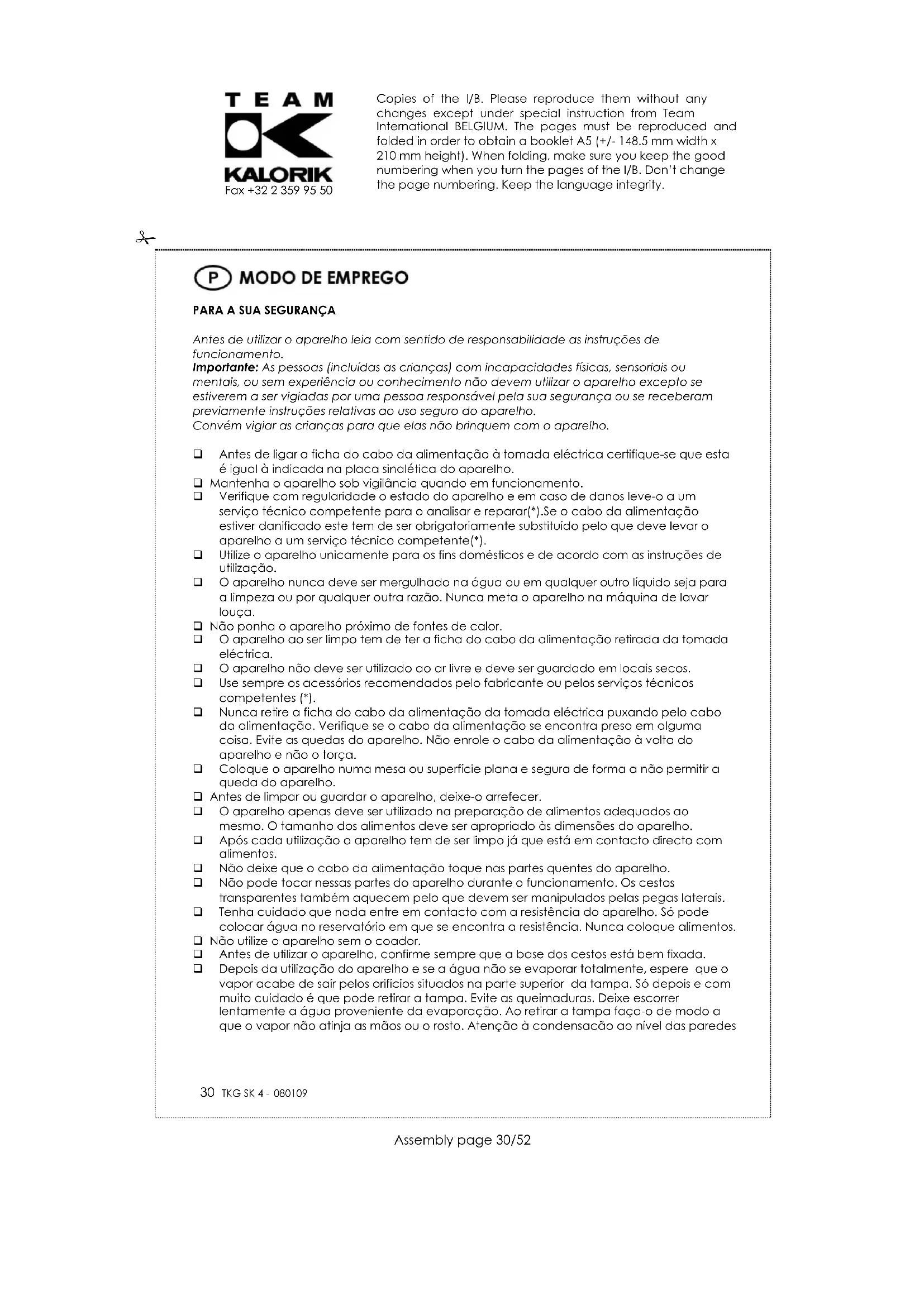 PROTECÇÃO DO MEIO AMBIENTE – DIRECTIVA 2002/96/CE Para a preservação do ambiente e da nossa saúde, a eliminação no fim da vida útil dos aparelhos eléctricos e electrónicos, deve-se efectuar no cumprimento das legislações em vigor e pela participação de todos quer sejam produtores ou utilizadores. É por esta razão que o vosso aparelho tem na placa sinalética o simbolo , informando que em caso algum o aparelho deve ser colocado no caixote do lixo camarário ou privado para que não vá para as lixeiras comuns mas sim devolvido ao revendedor ou depositado nos locais apropriados e identificados para a recolha destes aparelhos para que uma vez recolhidos sejam reciclados, reutilizados ou lhe sejam dados outras aplicações. Copies of the I/B. Please reproduce them without any changes except under special instruction from Team International BELGIUM. The pages must be reproduced and folded in order to obtain a booklet A5 (+/- 148.5 mm width x 210 mm height). When folding, make sure you keep the good numbering when you turn the pages of the I/B. Don’t change the page numbering. Keep the language integrity.