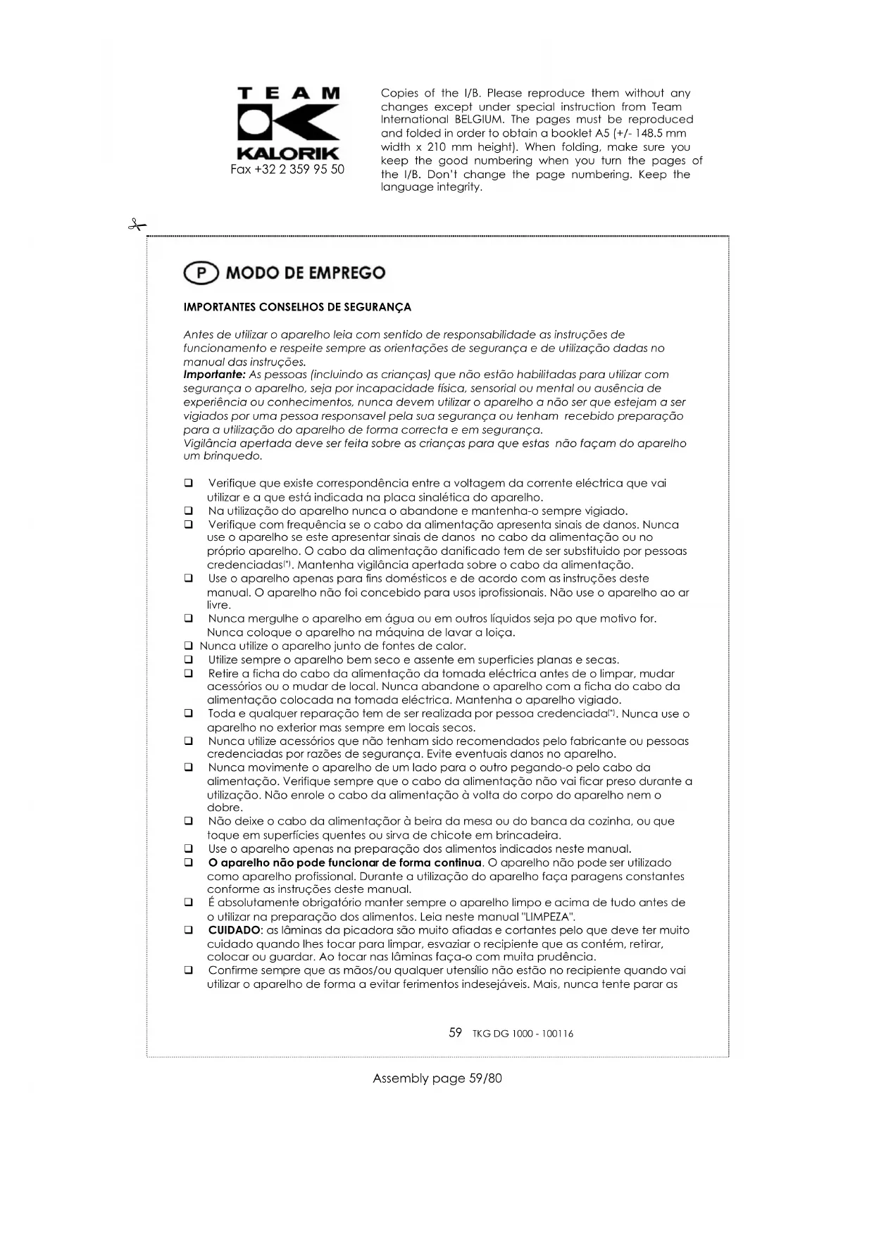 PROTECÇÃO DO MEIO AMBIENTE – DIRECTIVA 2002/96/CE Para a preservação do ambiente e da nossa saúde, a eliminação no fim da vida útil dos aparelhos eléctricos e electrónicos, deve-se efectuar no cumprimento das legislações em vigor e pela participação de todos quer sejam produtores ou utilizadores. É por esta razão que o vosso aparelho tem na placa sinalética o símbolo , informando que em caso algum o aparelho deve ser colocado no caixote do lixo camarário ou privado para que não vá para as lixeiras comuns mas sim devolvido ao revendedor ou depositado nos locais apropriados e identificados para a recolha destes aparelhos para que uma vez recolhidos sejam reciclados, reutilizados ou lhe sejam dados outras aplicações. Copies of the I/B. Please reproduce them without any changes except under special instruction from Team International BELGIUM. The pages must be reproduced and folded in order to obtain a booklet A5 (+/- 148.5 mm width x 210 mm height). When folding, make sure you keep the good numbering when you turn the pages of the I/B. Don’t change the page numbering. Keep the language integrity.