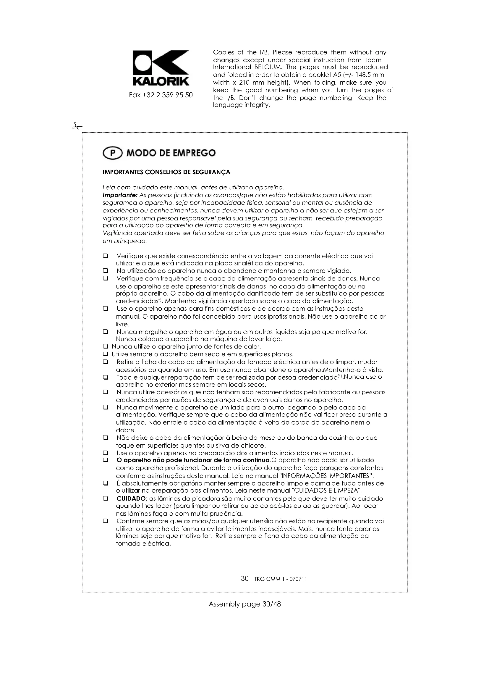- Lave-a em sabonária quente - Seque-a muito bem QUANDO PREPARA ALIMENTOS TAIS COMO CENOURAS ALGUMAS PARTES DO APARELHO FICAM COLORIDAS. SIGA AS INSTRUÇÕES DOS CUIDADOS ACIMA INDICADOS-TAL NÃO AFECTA O BOM FUNCIONAMENTO DO APARELHO. PROTECÇÃO DO MEIO AMBIENTE – DIRECTIVA 2002/96/CE Para a preservação do ambiente e da nossa saúde, a eliminação no fim da vida útil dos aparelhos eléctricos e electrónicos, deve-se efectuar no cumprimento das legislações em vigor e pela participação de todos quer sejam produtores ou utilizadores. É por esta razão que o vosso aparelho tem na placa sinalética o símbolo , informando que em caso algum o aparelho deve ser colocado no caixote do lixo camarário ou privado para que não vá para as lixeiras comuns mas sim devolvido ao revendedor ou depositado nos locais apropriados e identificados para a recolha destes aparelhos para que uma vez recolhidos sejam reciclados, reutilizados ou lhe sejam dados outras aplicações. Copies of the I/B. Please reproduce them without any changes except under special instruction from Team International BELGIUM. The pages must be reproduced and folded in order to obtain a booklet A5 (+/- 148.5 mm width x 210 mm height). When folding, make sure you keep the good numbering when you turn the pages of the I/B. Don’t change the page numbering. Keep the language integrity.