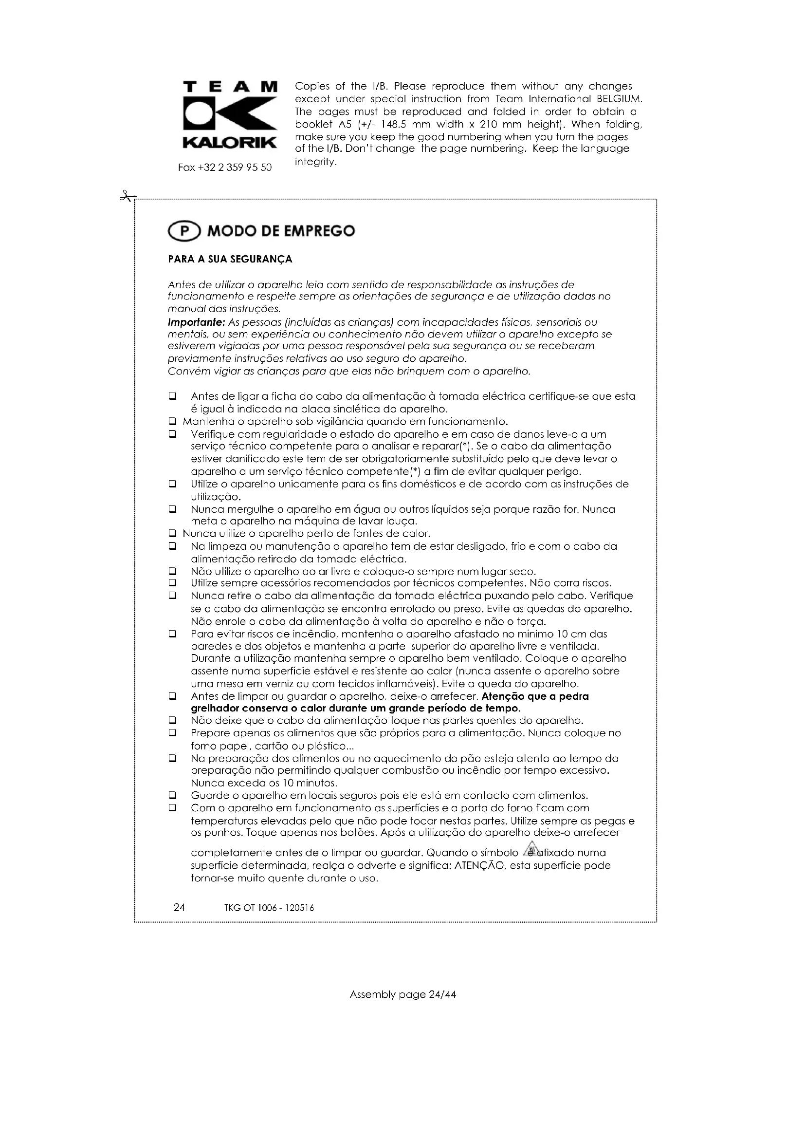 Antes de utilizar o aparelho leia com sentido de responsabilidade as instruções de funcionamento e respeite sempre as orientações de segurança e de utilização dadas no manual das instruções. Importante: As pessoas (incluídas as crianças) com incapacidades físicas, sensoriais ou mentais, ou sem experiência ou conhecimento não devem utilizar o aparelho excepto se estiverem vigiadas por uma pessoa responsável pela sua segurança ou se receberam previamente instruções relativas ao uso seguro do aparelho. Convém vigiar as crianças para que elas não brinquem com o aparelho. Antes de ligar a ficha do cabo da alimentação à tomada eléctrica certifique-se que esta é igual à indicada na placa sinalética do aparelho. Mantenha o aparelho sob vigilância quando em funcionamento. Verifique com regularidade o estado do aparelho e em caso de danos leve-o a um serviço técnico competente para o analisar e reparar(*). Se o cabo da alimentação estiver danificado este tem de ser obrigatoriamente substituído pelo que deve levar o aparelho a um serviço técnico competente(*) a fim de evitar qualquer perigo. Utilize o aparelho unicamente para os fins domésticos e de acordo com as instruções de utilização. Nunca mergulhe o aparelho em água ou outros líquidos seja porque razão for. Nunca meta o aparelho na máquina de lavar louça. Nunca utilize o aparelho perto de fontes de calor. Na limpeza ou manutenção o aparelho tem de estar desligado, frio e com o cabo da alimentação retirado da tomada eléctrica. Não utilize o aparelho ao ar livre e coloque-o sempre num lugar seco. Utilize sempre acessórios recomendados por técnicos competentes. Não corra riscos. Nunca retire o cabo da alimentação da tomada eléctrica puxando pelo cabo. Verifique se o cabo da alimentação se encontra enrolado ou preso. Evite as quedas do aparelho. Não enrole o cabo da alimentação à volta do aparelho e não o torça. Para evitar riscos de incêndio, mantenha o aparelho afastado no mínimo 10 cm das paredes e dos objetos e mantenha a parte superior do aparelho livre e ventilada. Durante a utilização mantenha sempre o aparelho bem ventilado. Coloque o aparelho assente numa superfície estável e resistente ao calor (nunca assente o aparelho sobre uma mesa em verniz ou com tecidos inflamáveis). Evite a queda do aparelho. Antes de limpar ou guardar o aparelho, deixe-o arrefecer. Atenção que a pedra grelhador conserva o calor durante um grande período de tempo. Não deixe que o cabo da alimentação toque nas partes quentes do aparelho. Prepare apenas os alimentos que são próprios para a alimentação. Nunca coloque no forno papel, cartão ou plástico... Na preparação dos alimentos ou no aquecimento do pão esteja atento ao tempo da preparação não permitindo qualquer combustão ou incêndio por tempo excessivo. Nunca exceda os 10 minutos. Guarde o aparelho em locais seguros pois ele está em contacto com alimentos. Com o aparelho em funcionamento as superfícies e a porta do forno ficam com temperaturas elevadas pelo que não pode tocar nestas partes. Utilize sempre as pegas e os punhos. Toque apenas nos botões. Após a utilização do aparelho deixe-o arrefecer completamente antes de o limpar ou guardar. Quando o símbolo é afixado numa superfície determinada, realça o adverte e significa: ATENÇÃO, esta superfície pode tornar-se muito quente durante o uso.Copies of the I/B. Please reproduce them without any changes except under special instruction from Team International BELGIUM. The pages must be reproduced and folded in order to obtain a booklet A5 (+/- 148.5 mm width x 210 mm height). When folding, make sure you keep the good numbering when you turn the pages of the I/B. Don’t change the page numbering. Keep the language integrity.