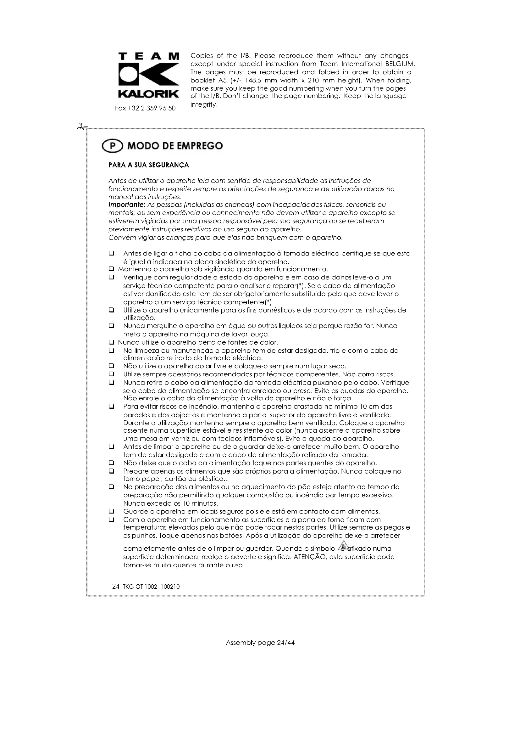 Antes de utilizar o aparelho leia com sentido de responsabilidade as instruções de funcionamento e respeite sempre as orientações de segurança e de utilização dadas no manual das instruções. Importante: As pessoas (incluídas as crianças) com incapacidades físicas, sensoriais ou mentais, ou sem experiência ou conhecimento não devem utilizar o aparelho excepto se estiverem vigiadas por uma pessoa responsável pela sua segurança ou se receberam previamente instruções relativas ao uso seguro do aparelho. Convém vigiar as crianças para que elas não brinquem com o aparelho. Antes de ligar a ficha do cabo da alimentação à tomada eléctrica certifique-se que esta é igual à indicada na placa sinalética do aparelho. Mantenha o aparelho sob vigilância quando em funcionamento. Verifique com regularidade o estado do aparelho e em caso de danos leve-o a um serviço técnico competente para o analisar e reparar(*). Se o cabo da alimentação estiver danificado este tem de ser obrigatoriamente substituído pelo que deve levar o aparelho a um serviço técnico competente(*). Utilize o aparelho unicamente para os fins domésticos e de acordo com as instruções de utilização. Nunca mergulhe o aparelho em água ou outros líquidos seja porque razão for. Nunca meta o aparelho na máquina de lavar louça. Nunca utilize o aparelho perto de fontes de calor. Na limpeza ou manutenção o aparelho tem de estar desligado, frio e com o cabo da alimentação retirado da tomada eléctrica. Não utilize o aparelho ao ar livre e coloque-o sempre num lugar seco. Utilize sempre acessórios recomendados por técnicos competentes. Não corra riscos. Nunca retire o cabo da alimentação da tomada eléctrica puxando pelo cabo. Verifique se o cabo da alimentação se encontra enrolado ou preso. Evite as quedas do aparelho. Não enrole o cabo da alimentação à volta do aparelho e não o torça. Para evitar riscos de incêndio, mantenha o aparelho afastado no mínimo 10 cm das paredes e dos objectos e mantenha a parte superior do aparelho livre e ventilada. Durante a utilização mantenha sempre o aparelho bem ventilado. Coloque o aparelho assente numa superfície estável e resistente ao calor (nunca assente o aparelho sobre uma mesa em verniz ou com tecidos inflamáveis). Evite a queda do aparelho. Antes de limpar o aparelho ou de o guardar deixe-o arrefecer muito bem. O aparelho tem de estar desligado e com o cabo da alimentação retirado da tomada. Não deixe que o cabo da alimentação toque nas partes quentes do aparelho. Prepare apenas os alimentos que são próprios para a alimentação. Nunca coloque no forno papel, cartão ou plástico... Na preparação dos alimentos ou no aquecimento do pão esteja atento ao tempo da preparação não permitindo qualquer combustão ou incêndio por tempo excessivo. Nunca exceda os 10 minutos. Guarde o aparelho em locais seguros pois ele está em contacto com alimentos. Com o aparelho em funcionamento as superfícies e a porta do forno ficam com temperaturas elevadas pelo que não pode tocar nestas partes. Utilize sempre as pegas e os punhos. Toque apenas nos botões. Após a utilização do aparelho deixe-o arrefecer completamente antes de o limpar ou guardar. Quando o símbolo é afixado numa superfície determinada, realça o adverte e significa: ATENÇÃO, esta superfície pode tornar-se muito quente durante o uso.Copies of the I/B. Please reproduce them without any changes except under special instruction from Team International BELGIUM. The pages must be reproduced and folded in order to obtain a booklet A5 (+/- 148.5 mm width x 210 mm height). When folding, make sure you keep the good numbering when you turn the pages of the I/B. Don’t change the page numbering. Keep the language integrity.